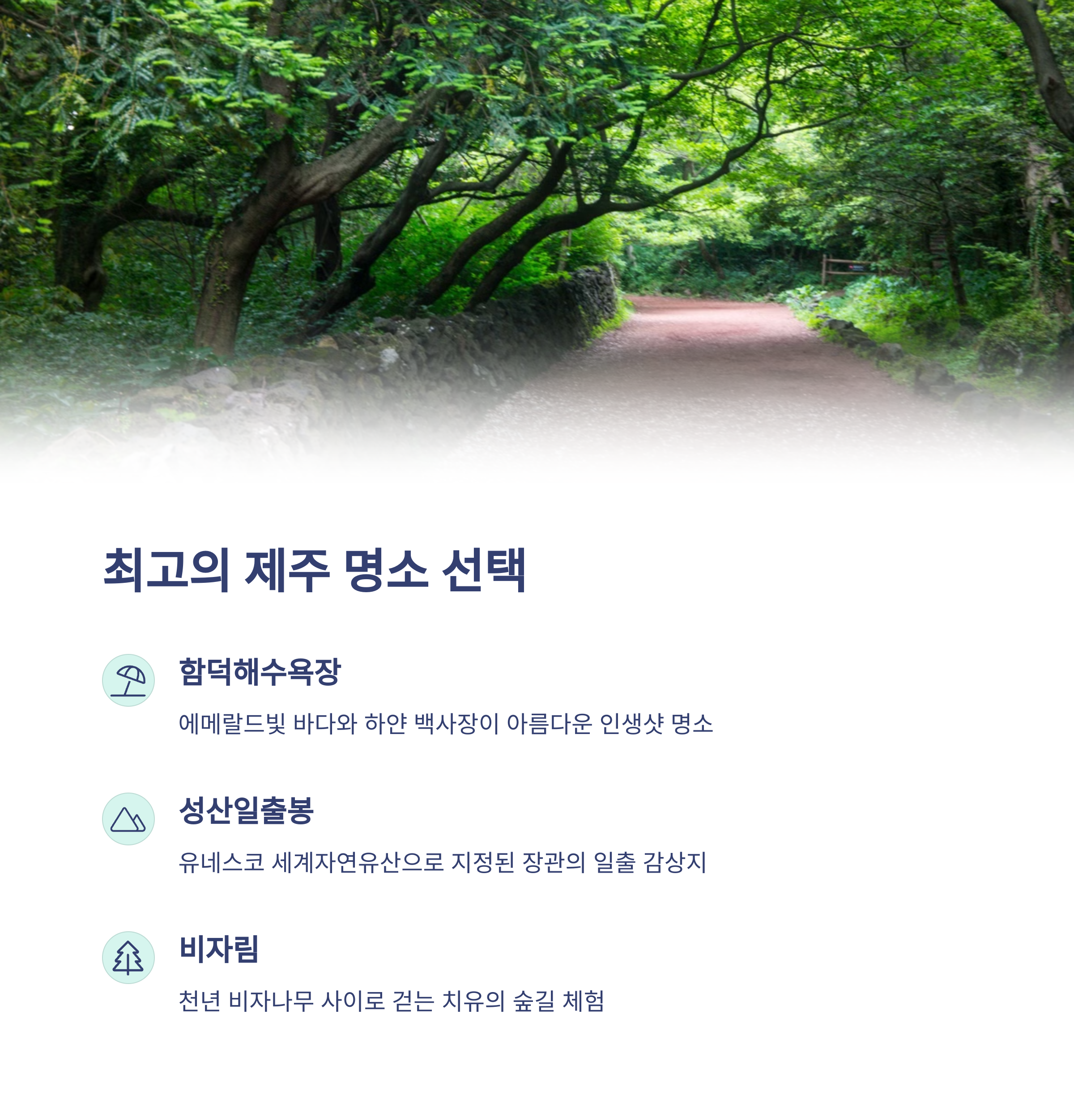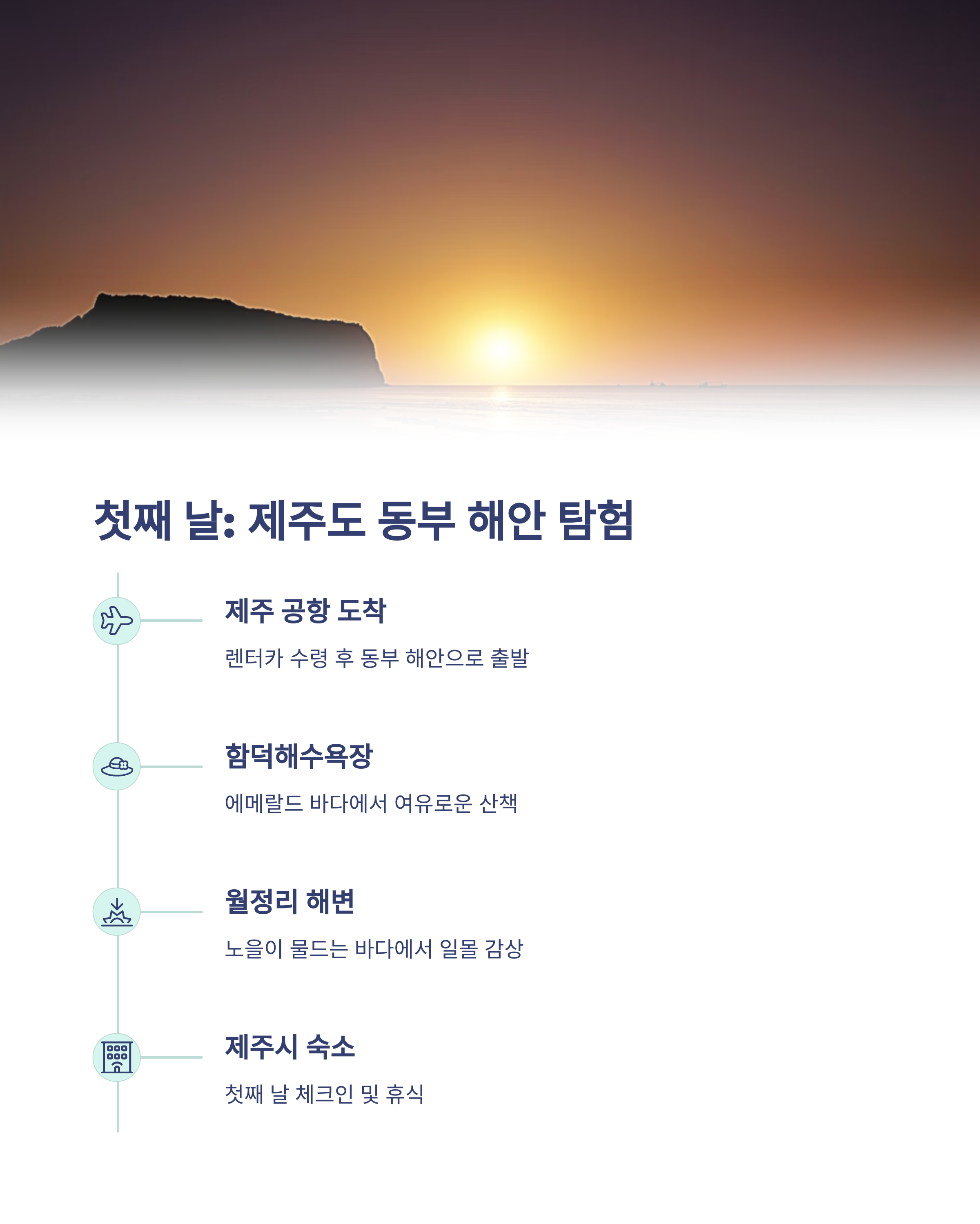 | 여행 핵심 장소 | 함덕, 성산일출봉, 비자림, 중문 |