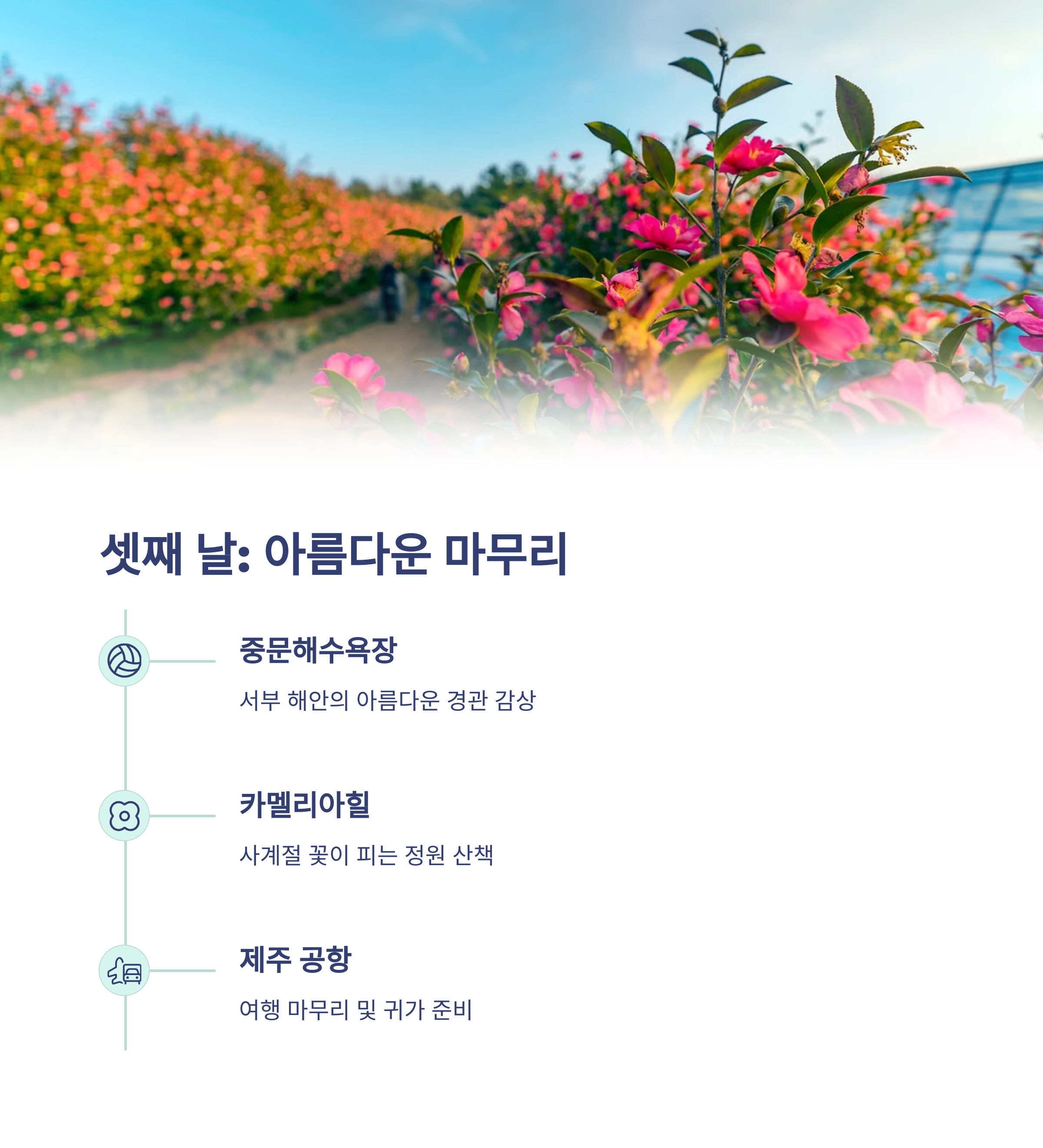 | 3일차: 중문, 힐링, 출국 | 중문해수욕장, 카멜리아힐 | 공항 근처 휴게식당 |