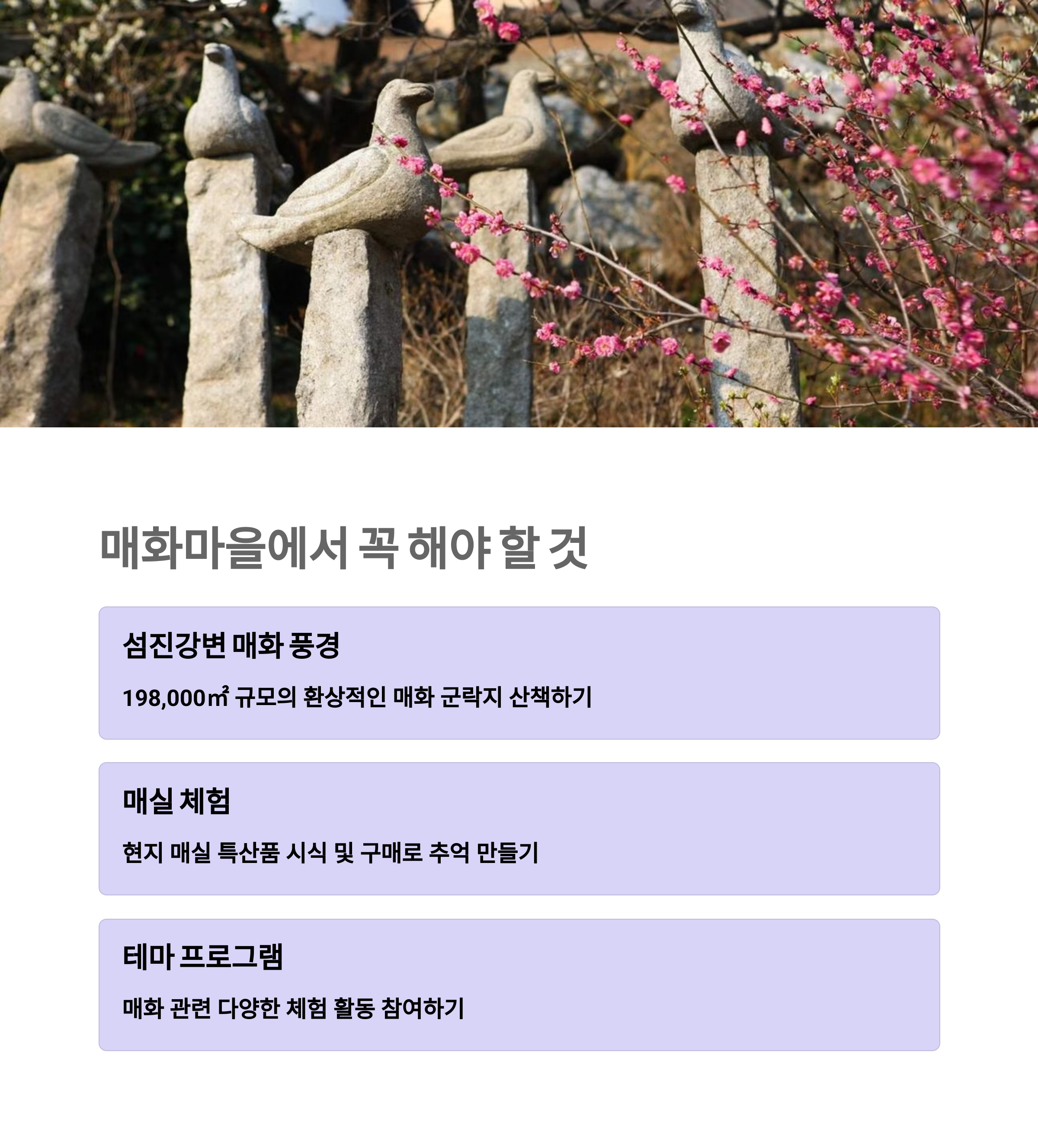 | 매화축제 막바지, 섬진강 풍경 감상 | 진해군항제, 벚꽃 절정 시기 | 홍매화와 사찰의 고요한 조화 |