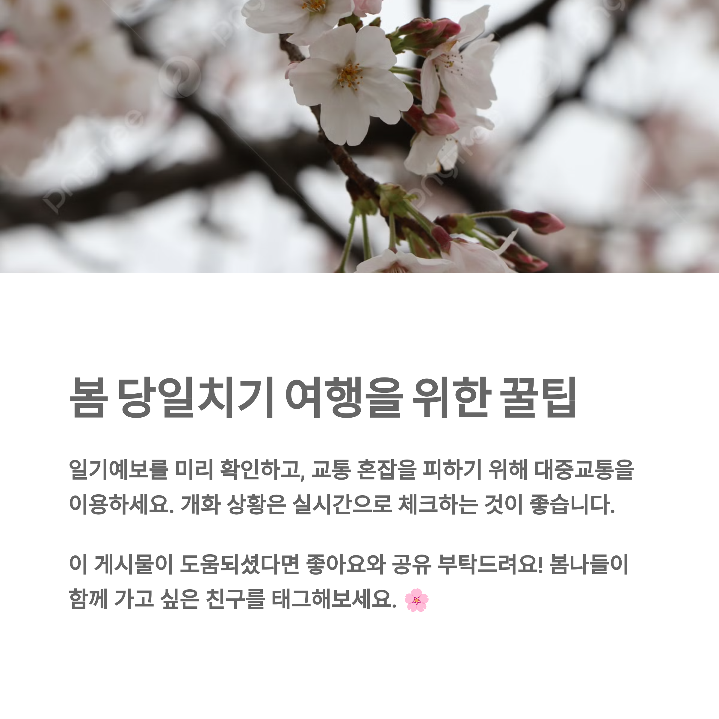 봄이 깊어가는 3월 말, 이번 주말 하루만에 다녀올 수 있는 당일치기 여행지를 찾고 있다면 주목하세요. 2025년 3월 30일 일요일, 전국 곳곳에서 봄꽃이 절정을 맞이하며 매화, 벚꽃, 개나리가 경쟁하듯 피어오르고 있습니다. 이번 추천지 세 곳은 단 하루의 여유만으로도 자연과 문화를 동시에 경험할 수 있는 완벽한 장소들입니다. 특히 짧은 일정에도 꽃놀이, 산책, 사찰 탐방까지 모두 가능한 코스로 구성했으니, 따뜻한 햇살 속에서 봄을 만끽해보세요. 날씨에 따라 이동 시간을 고려해 나만의 여행 루트를 짜보는 것도 좋겠습니다.