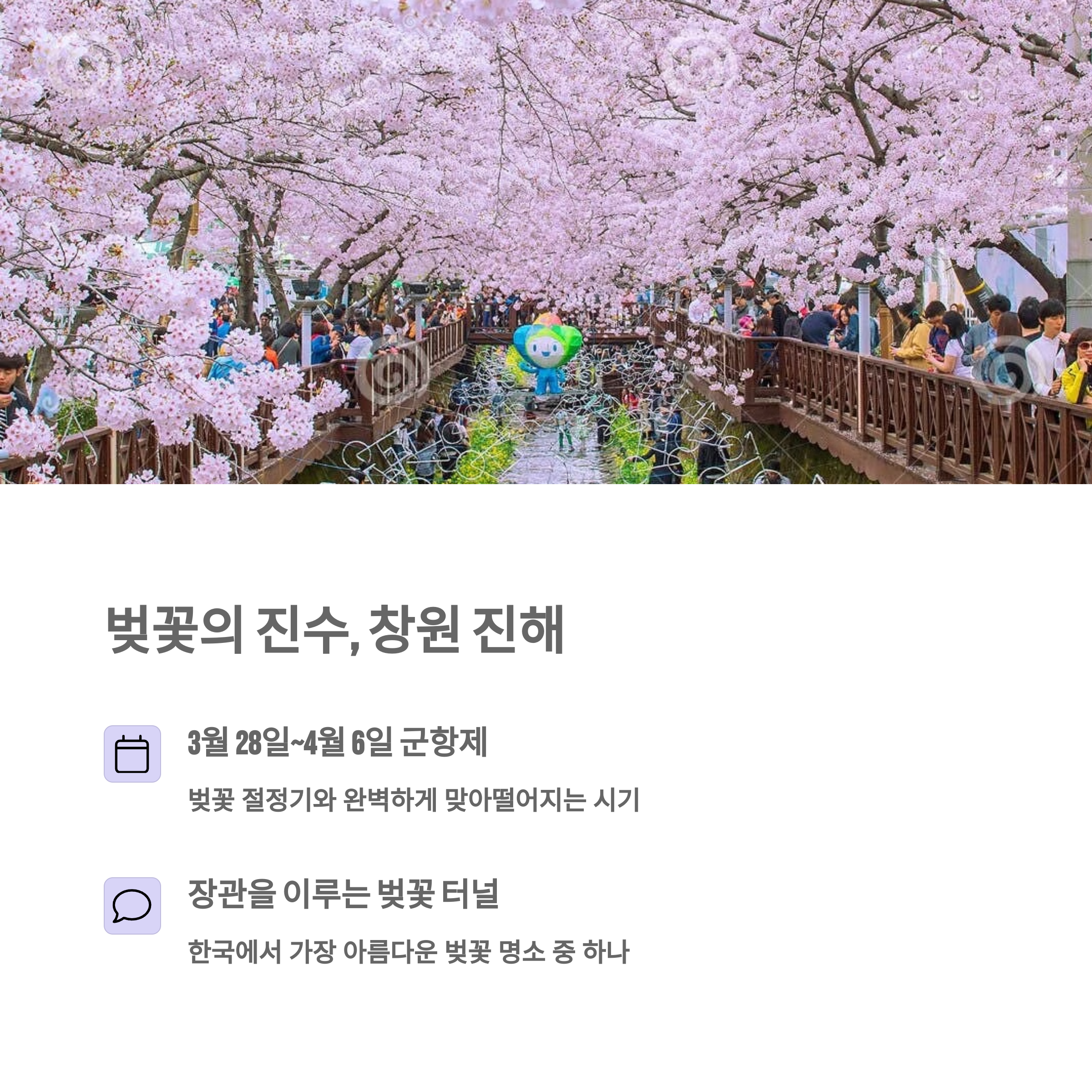 두 번째는 벚꽃의 성지로 불리는 창원 진해입니다. 진해군항제는 3월 28일부터 4월 6일까지 열리며, 3월 30일은 벚꽃이 절정에 이르는 시점으로 화려한 꽃길을 걷기에 딱 좋은 날입니다. 진해 여좌천을 따라 이어지는 벚꽃터널, 경화역 철길, 제황산 공원 등 사진 명소가 가득</strong하며, 소쿠리섬이나 편백치유의 숲까지 함께 들른다면 자연 속에서의 힐링 여행을 완성할 수 있습니다.
