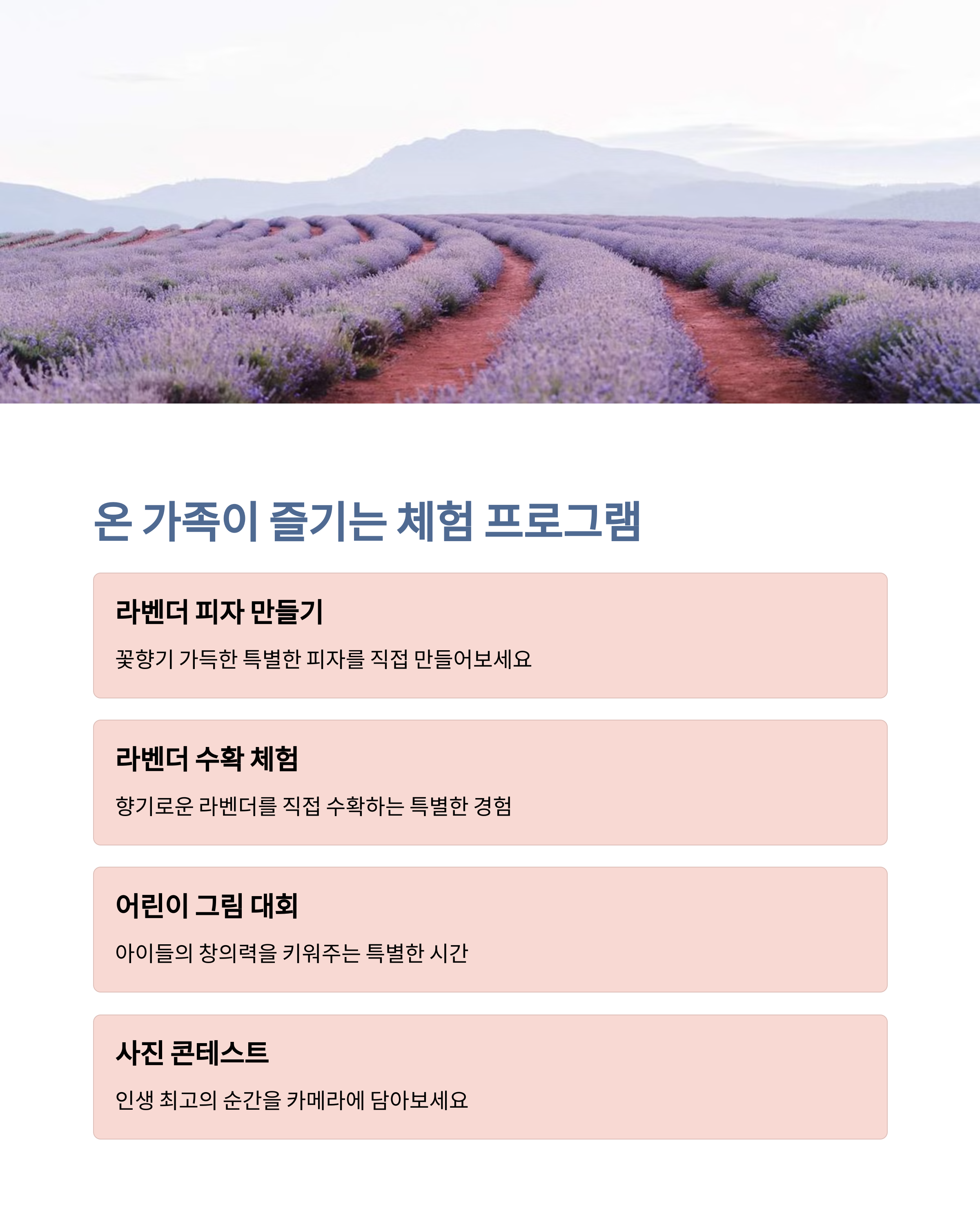 축제의 하이라이트는 라벤더 피자 만들기, 수확 체험, 어린이 그림 대회, 사진 콘테스트 등 다양하게 준비된 참여형 프로그램입니다. 단순히 꽃을 감상하는 것에 그치지 않고 오감을 자극하는 즐거움이 있어, 아이와 함께하는 가족 나들이 코스로도 적합합니다. 체험과 동시에 휴식을 누릴 수 있는 조경 공간도 잘 구성되어 있어 하루 종일 머물러도 지루하지 않은 것이 큰 장점입니다.