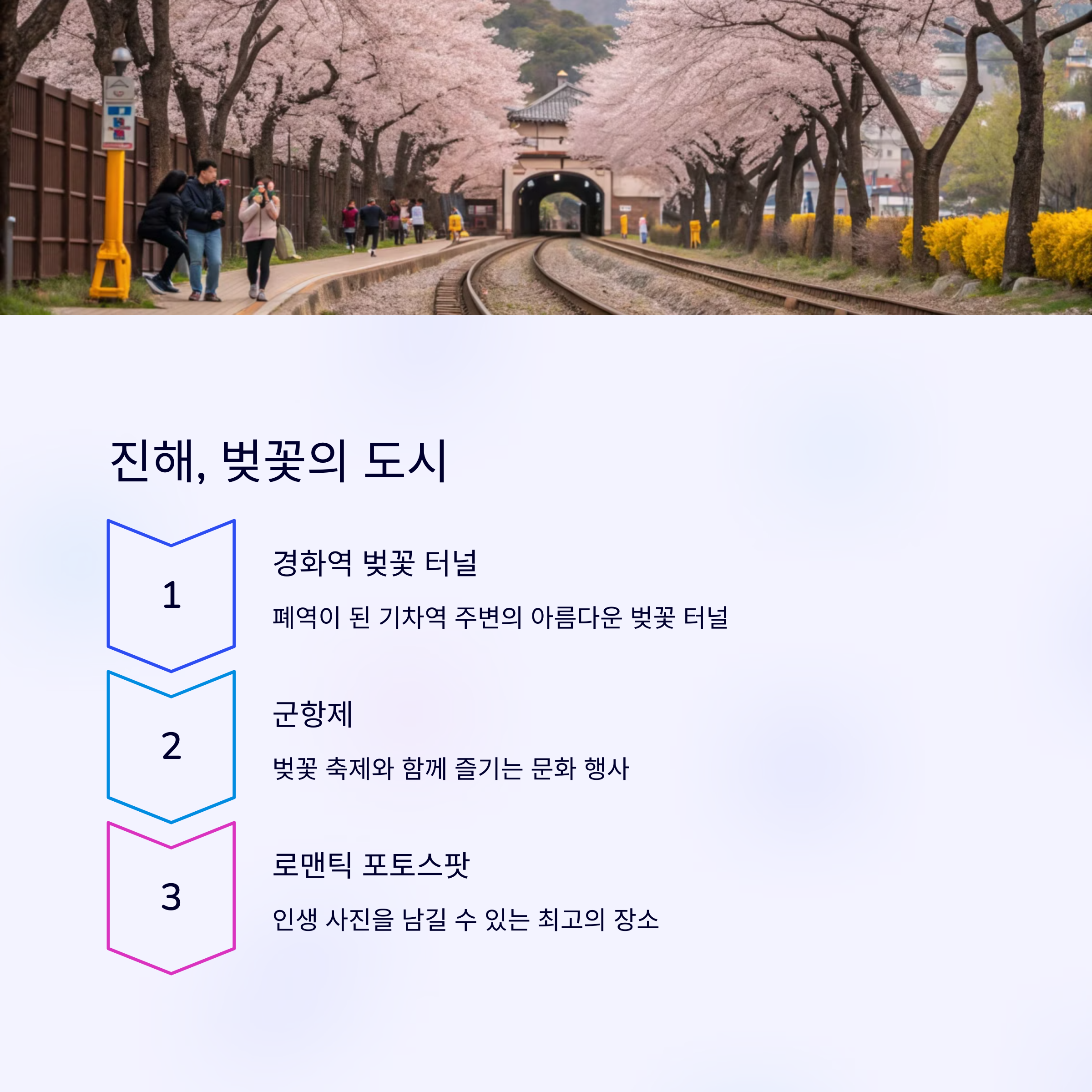 또한, 진해 경화역은 벚꽃 터널이 형성되어 한 폭의 그림 같은 풍경을 선사합니다. 강릉의 경포호 벚꽃길도 많은 사람들이 찾는 곳 중 하나입니다. 여행 일정에 맞춰 벚꽃 명소를 방문해 보세요!