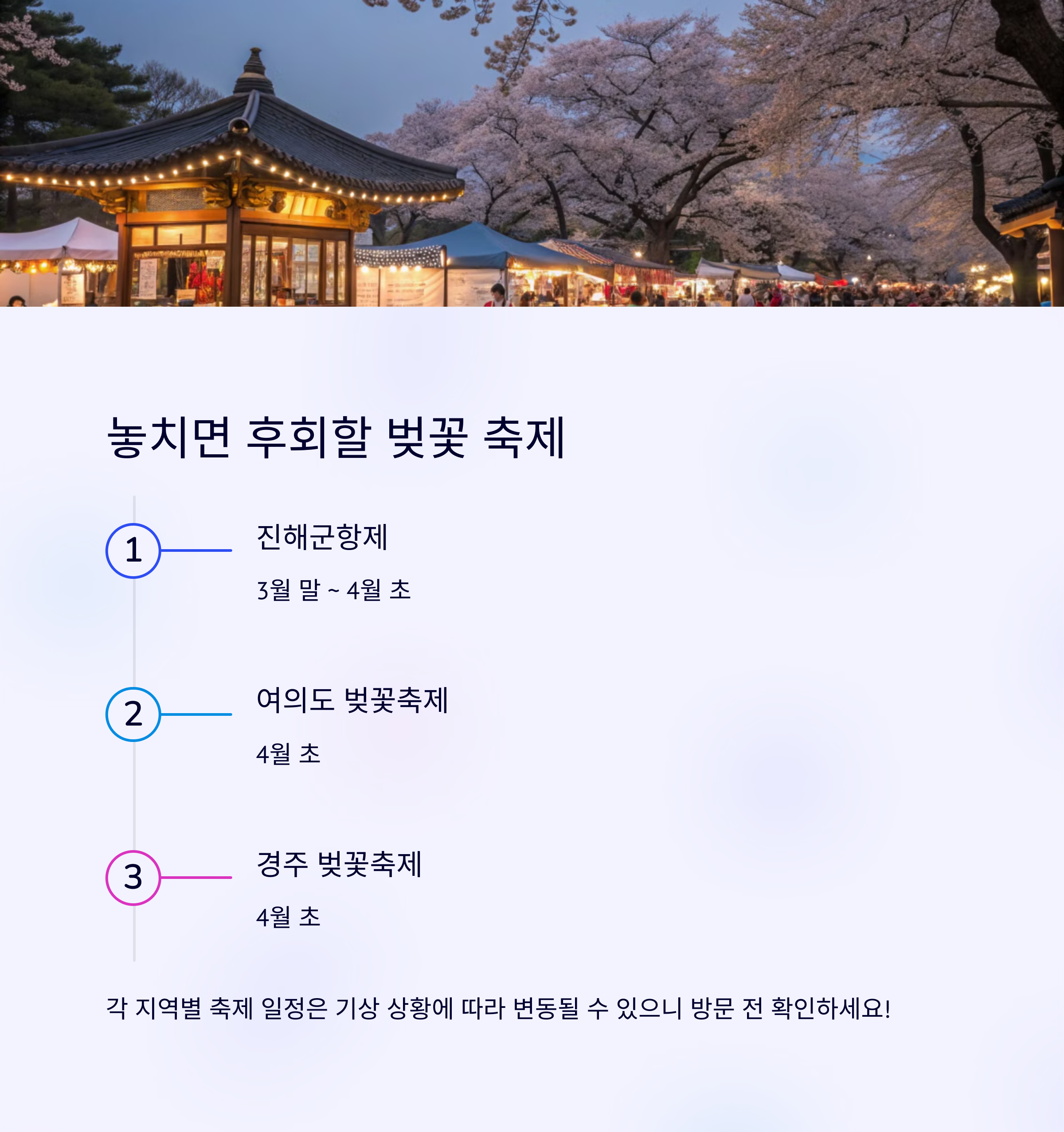 2025년 벚꽃 여행을 계획 중이신가요? 가장 기대되는 벚꽃 명소와 추천하고 싶은 장소를 댓글로 남겨 주세요!
