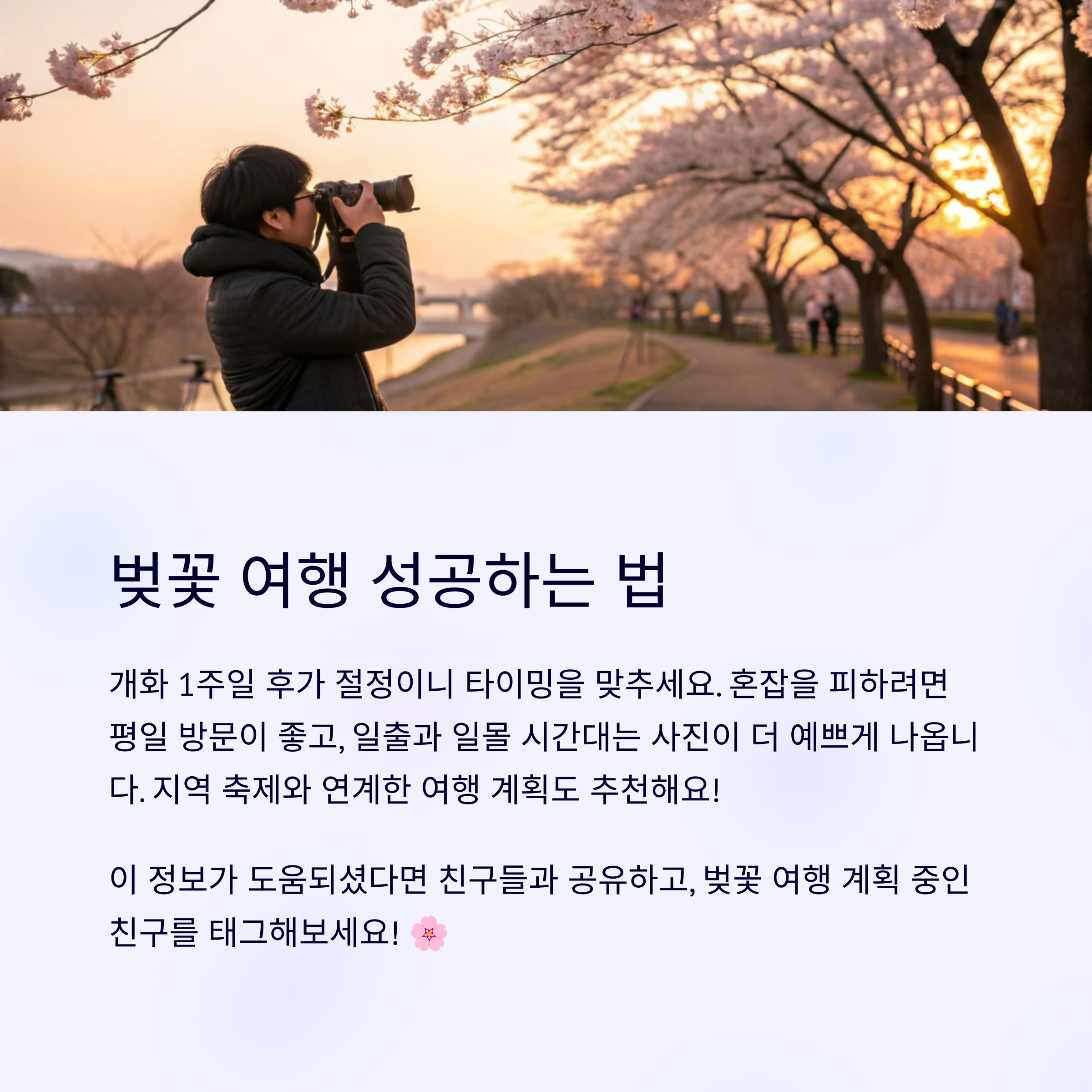 오전 10시~12시, 오후 3시~5시 사이가 빛이 가장 부드럽고 아름다운 사진을 찍기 좋습니다. 특히 일출 직후나 해질 무렵에는 더욱 감성적인 벚꽃 풍경을 만날 수 있습니다.