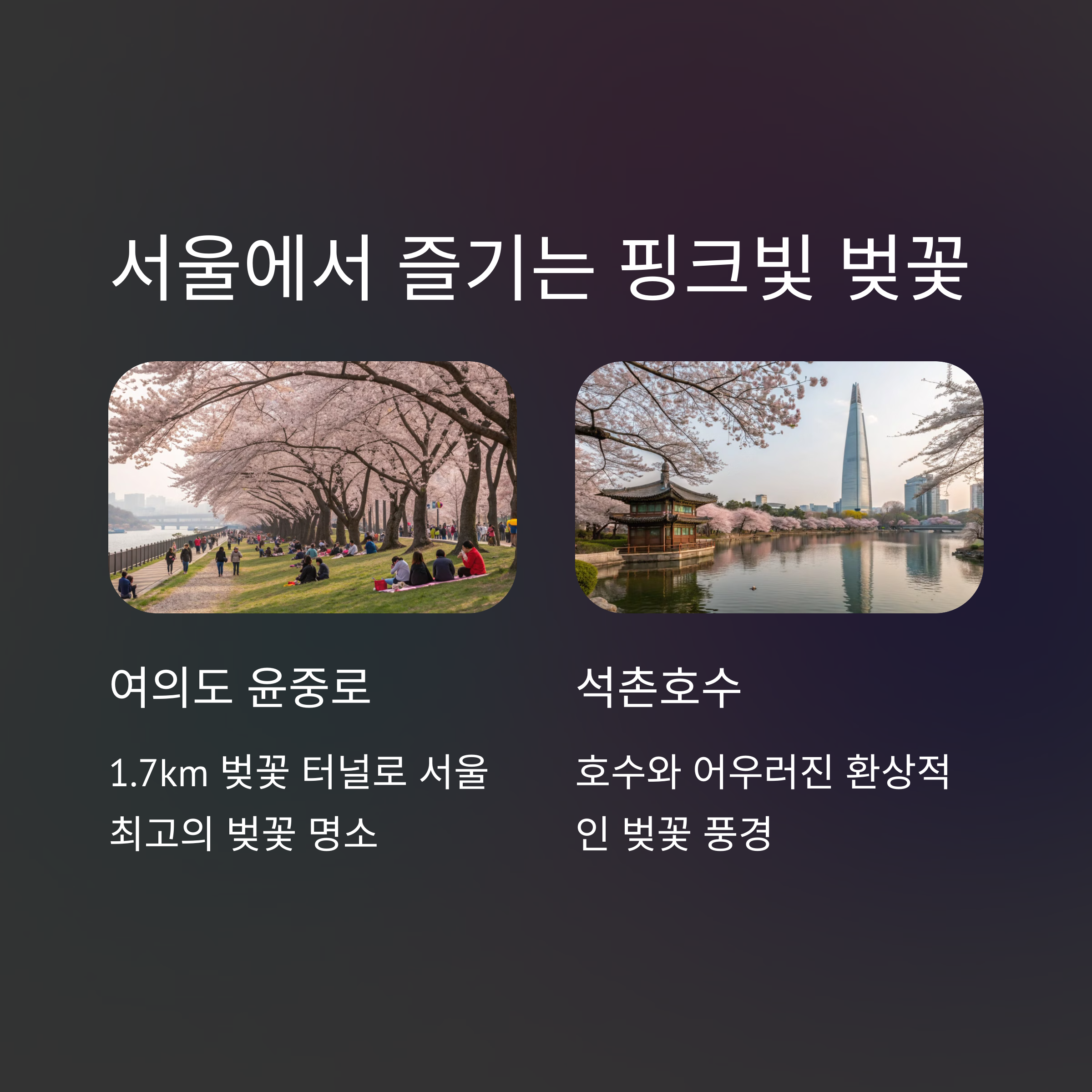 올해 벚꽃을 제대로 즐기고 싶다면, 명소를 미리 확인하고 여행을 준비하는 것이 중요합니다. 서울에서는 여의도 윤중로와 석촌호수가 대표적인 벚꽃 명소이며, 제주도에서는 서귀포 왕벚꽃 거리가 인기가 많습니다.
