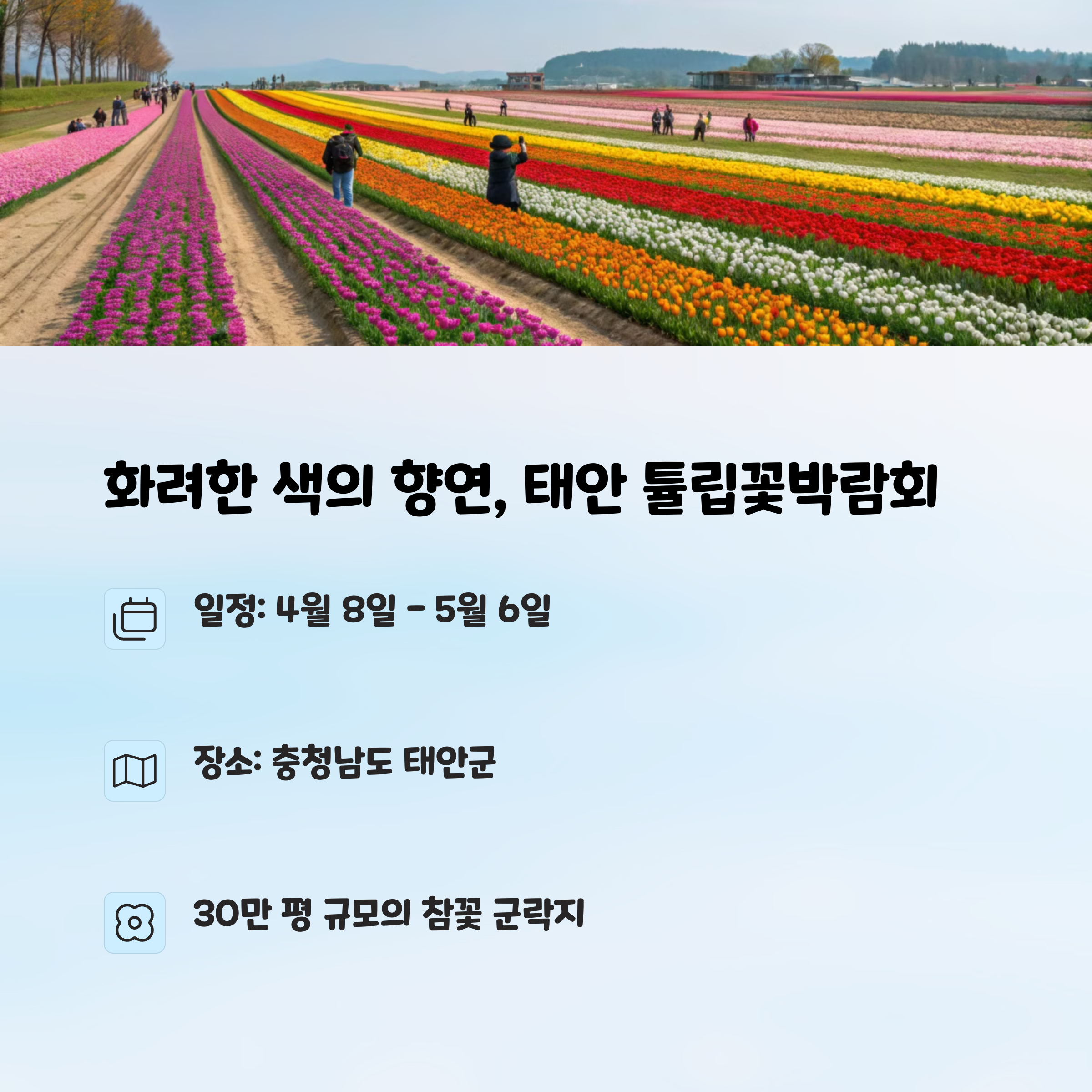 | 태안 튤립박람회 | 30만 평 규모의 튤립 군락지 (4/8~5/6). |