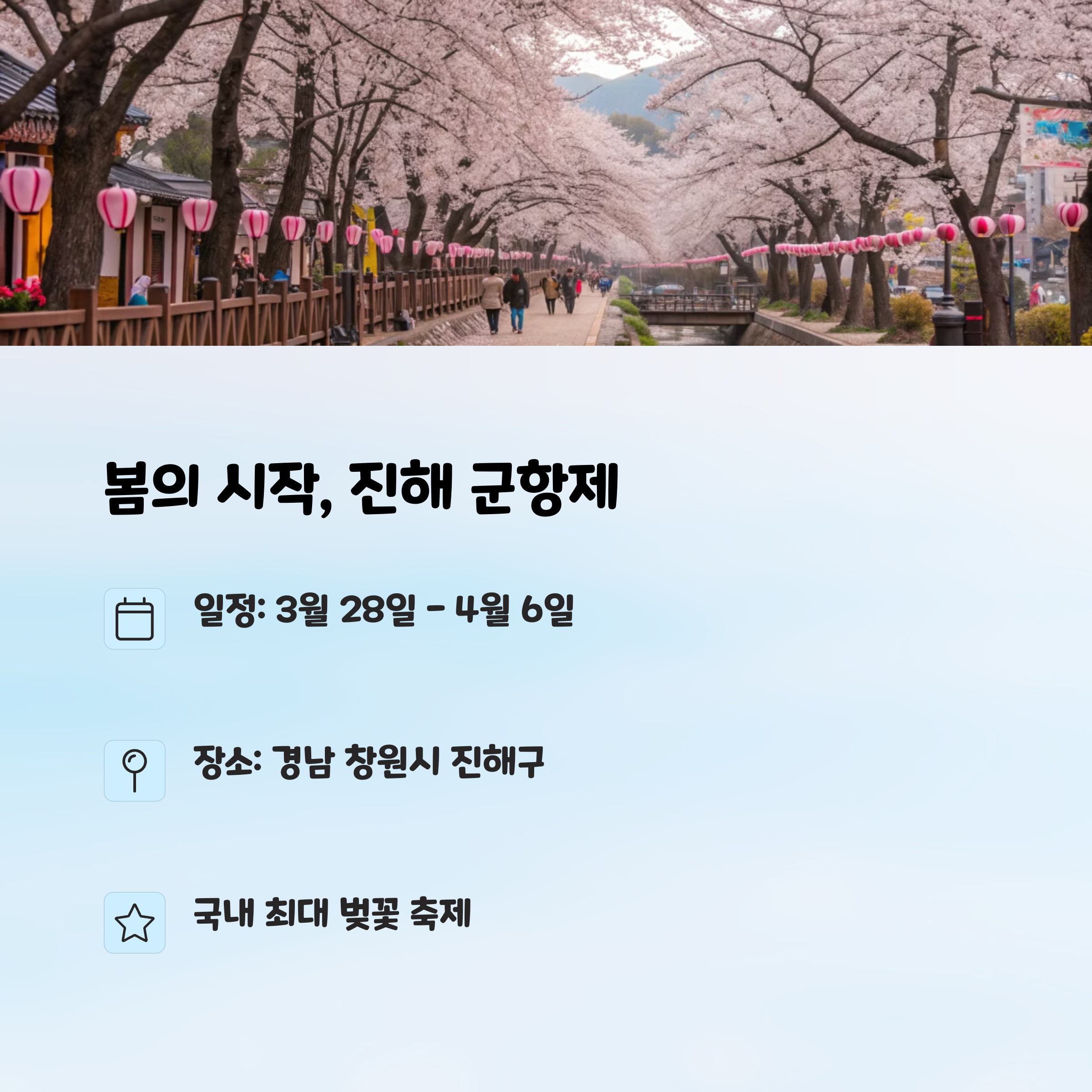 | 진해 군항제 | 국내 최대 규모의 벚꽃 축제 (3/28~4/6). |