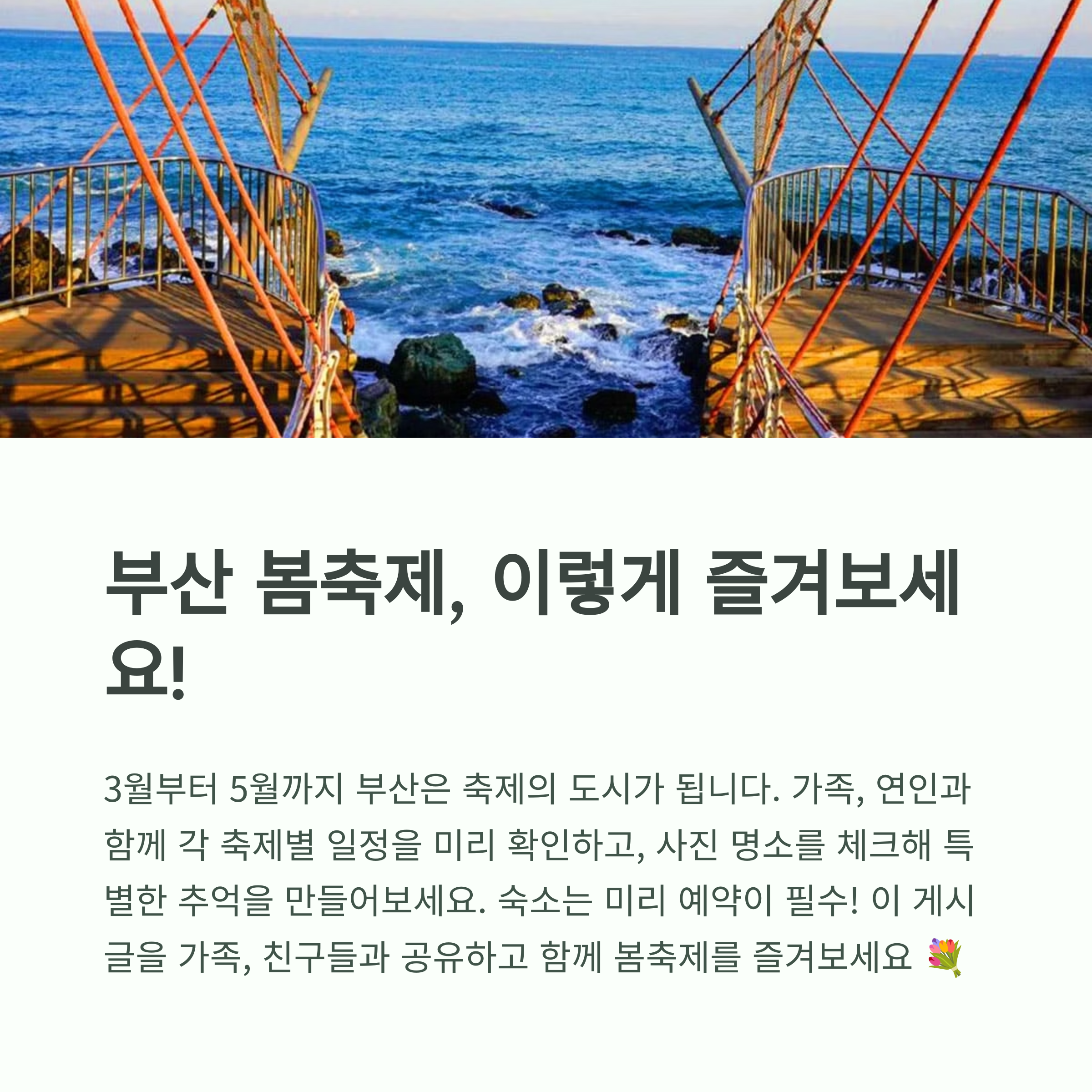 | 부산 봄축제 일정 | 3~5월, 부산 전역에서 다양한 꽃과 문화행사 개최 |