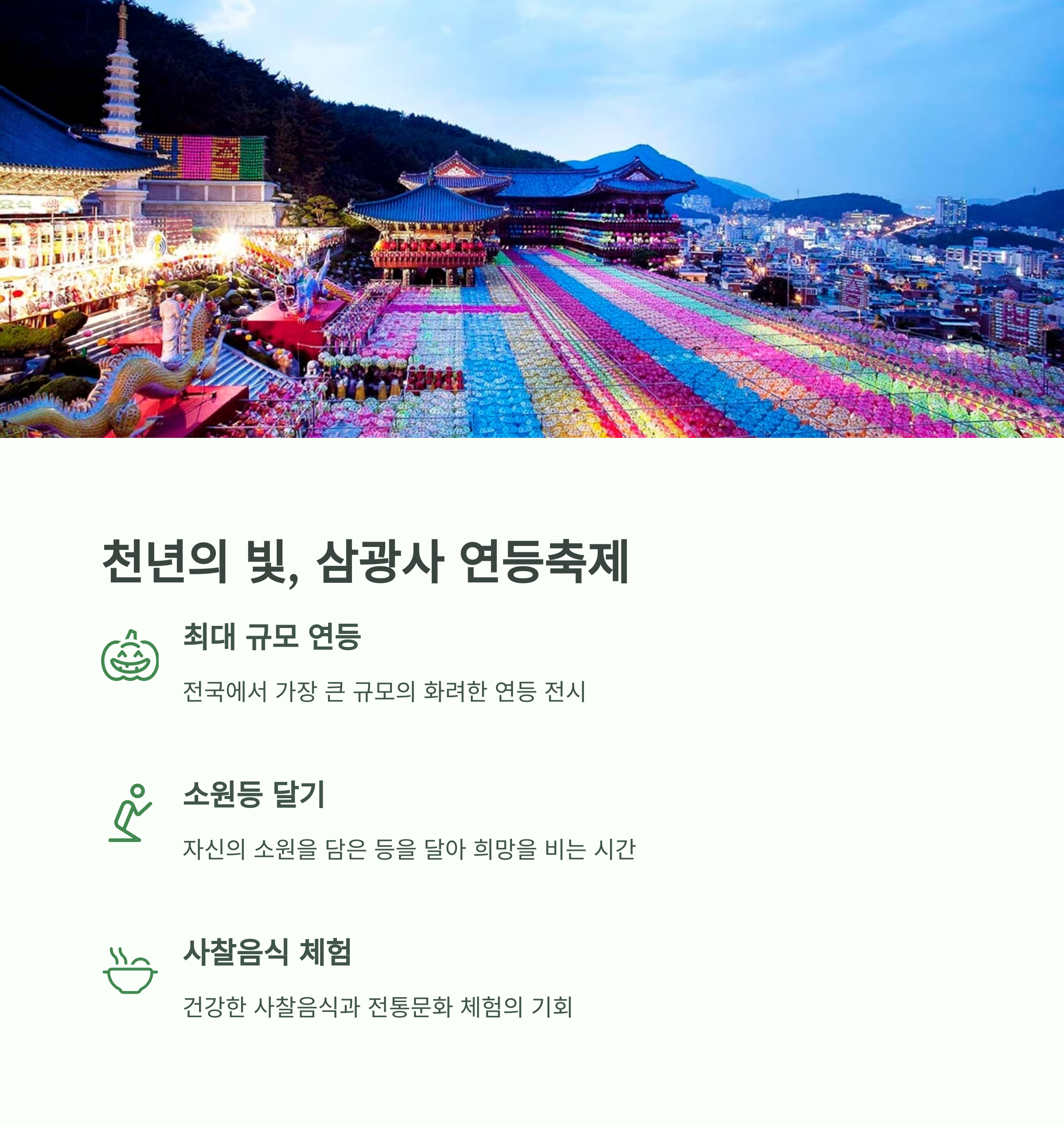 부산은 봄이 되면 도시 전역이 다채로운 축제로 가득 찹니다. 3월 말에는 대저생태공원에서 열리는 ‘강서 낙동강 30리 벚꽃축제’가 시작되어 하얗고 분홍빛의 벚꽃터널을 따라 걷는 즐거움을 선사합니다. 이어서 5월에는 광안리 해변에서 ‘광안리어방축제’가 개최되어 전통 어업 문화를 체험할 수 있고, 해운대 해수욕장에서는 ‘해운대 모래축제’를 통해 예술적인 모래 조형물과 함께 봄 햇살 아래에서 여유로운 시간을 보낼 수 있습니다. 삼광사에서는 화려한 연등으로 채워진 ‘연등축제’가 열려 밤하늘을 수놓는 불빛 속에서 깊은 감동을 느낄 수 있습니다.