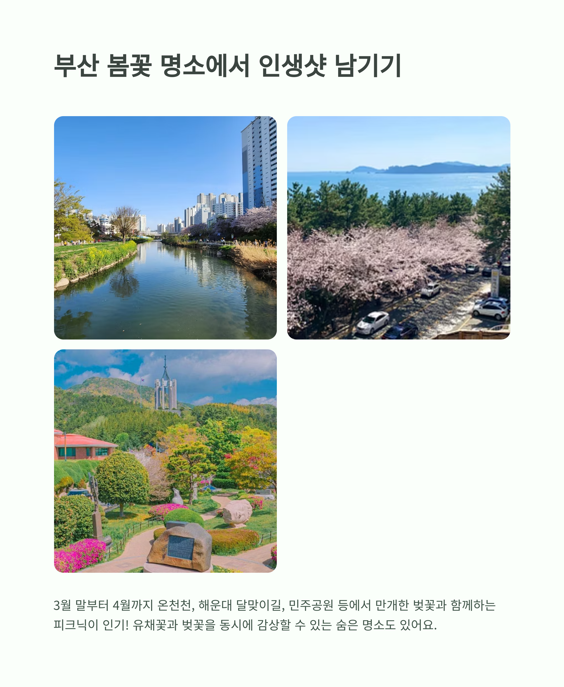 | 부산 봄축제 일정 | 3~5월, 부산 전역에서 다양한 꽃과 문화행사 개최 |