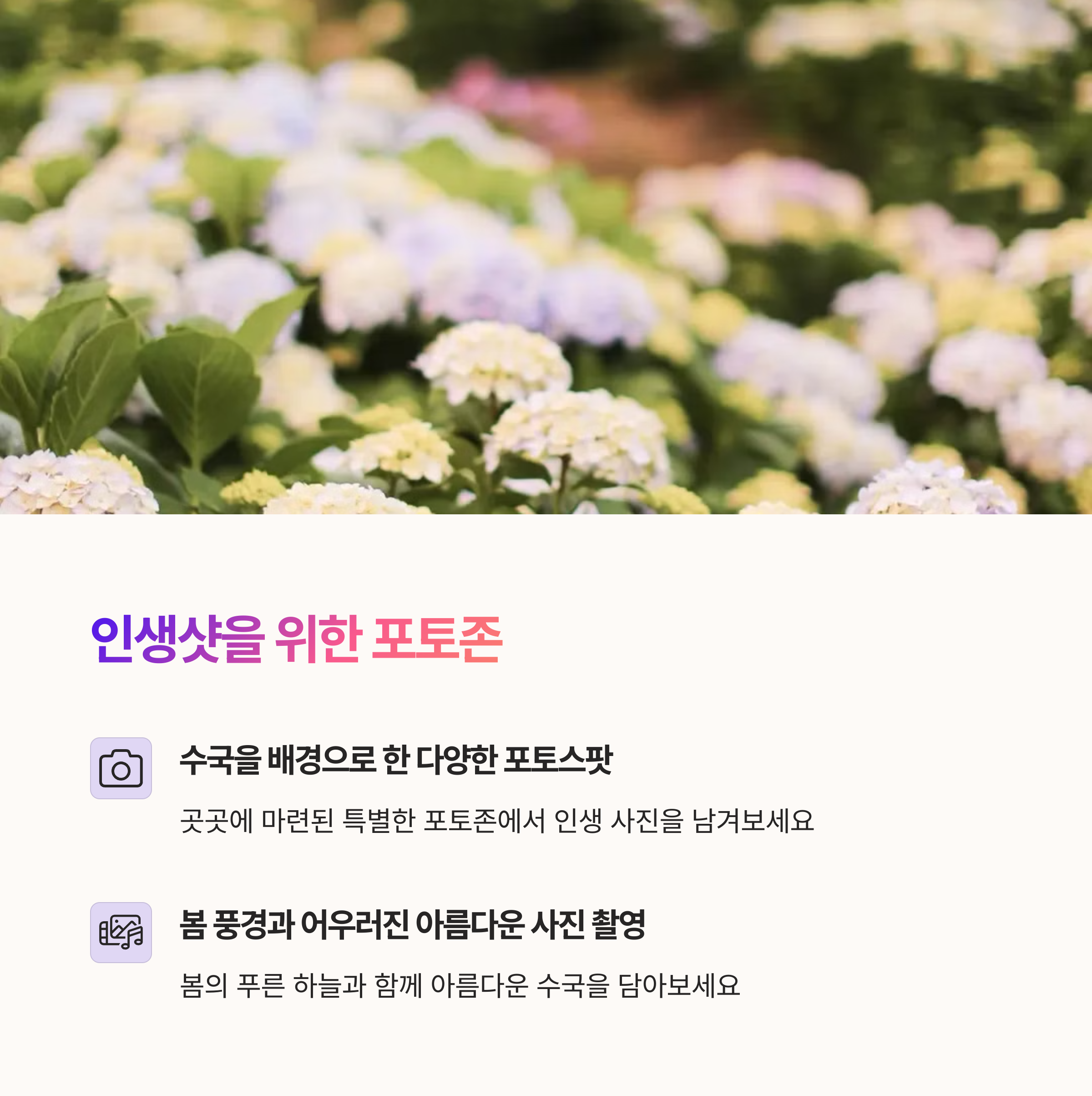 | 개화 시기 | 2025년 4월 첫 주부터 수국 정원 개방 |