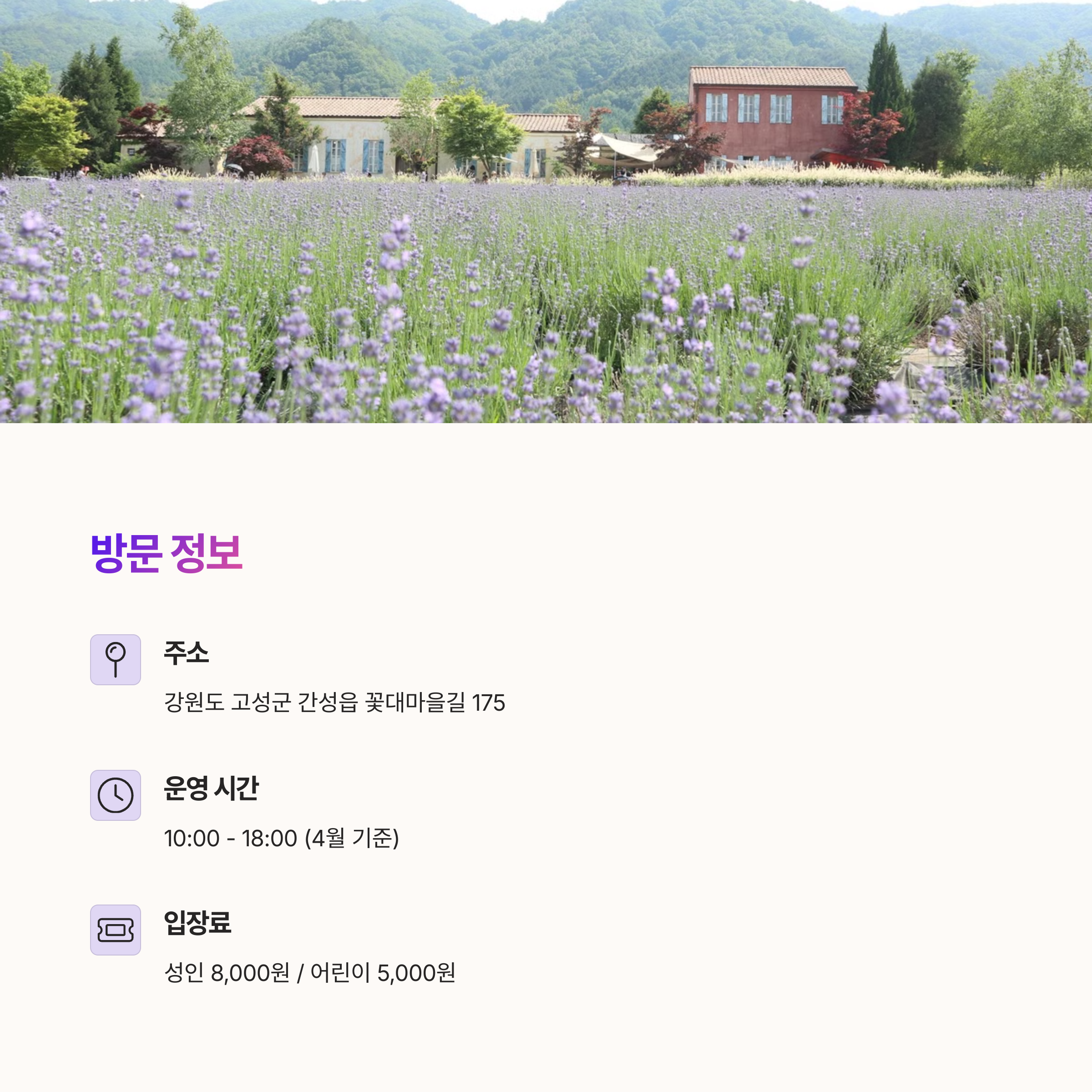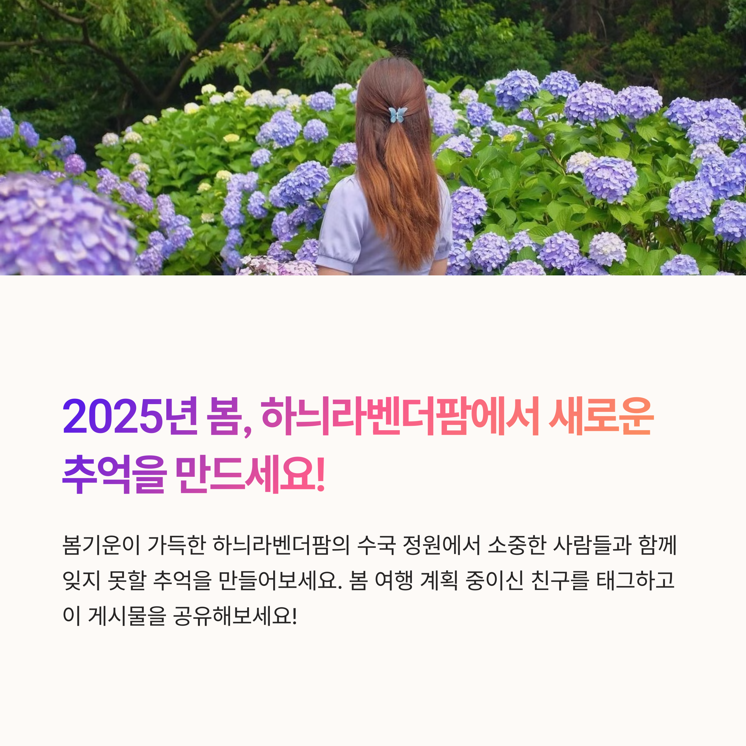 봄꽃이 하나둘 피어나는 4월, 고성 하늬라벤더팜에서는 라벤더가 아닌 수국으로 봄의 문을 엽니다. 2025년 봄, 하늬라벤더팜은 약 2만 평 규모의 부지에 다양한 수국 품종을 정원 형태로 조성해 색감 가득한 봄꽃 축제를 선보입니다. 여름보다 한적한 분위기 속에서 수국의 다채로운 컬러와 향기를 만끽하며 여유로운 산책과 감성적인 포토타임을 즐길 수 있는 곳, 따뜻한 음료 한 잔과 함께하는 자연 속 힐링, 4월 첫 주 고성 여행지로 강력 추천드립니다.