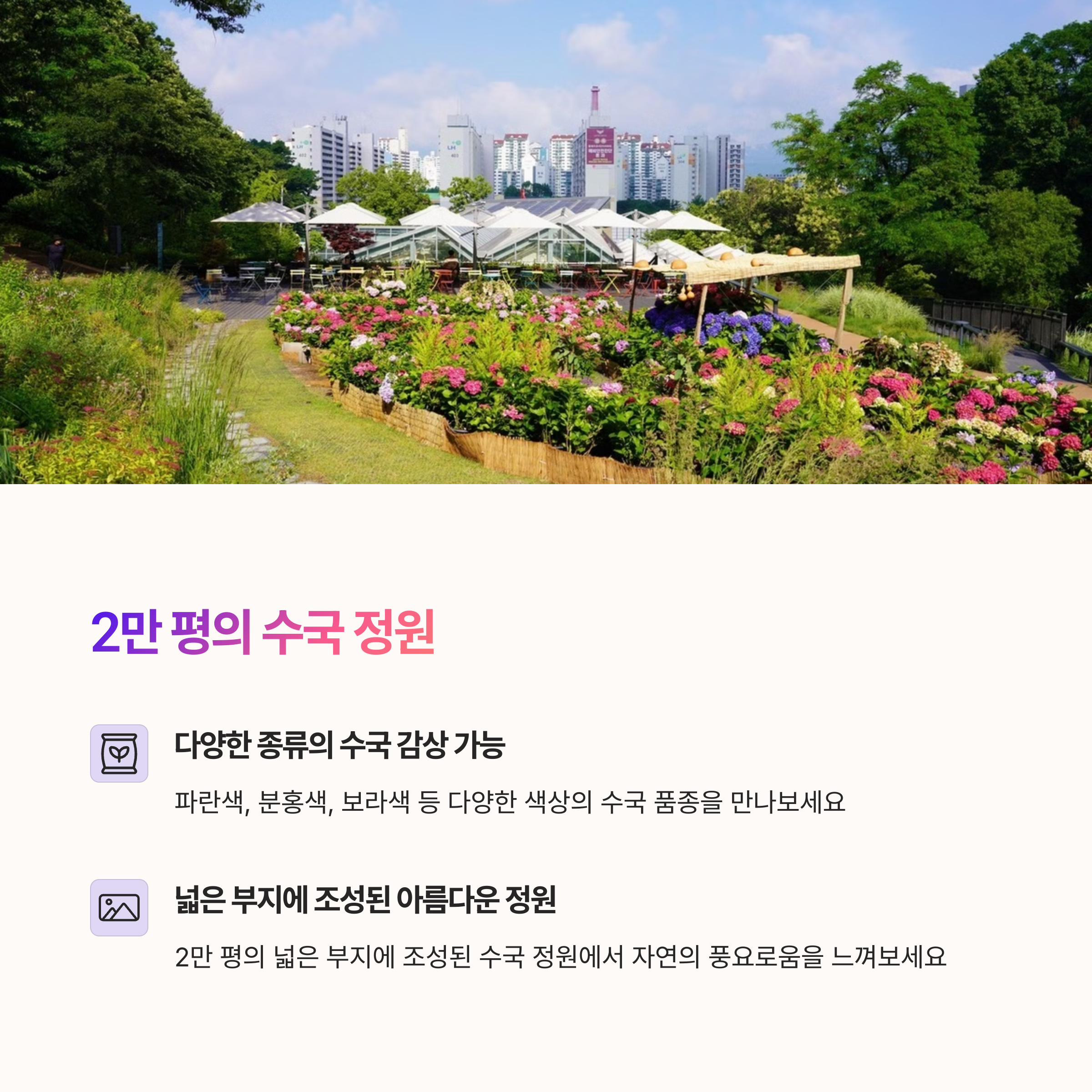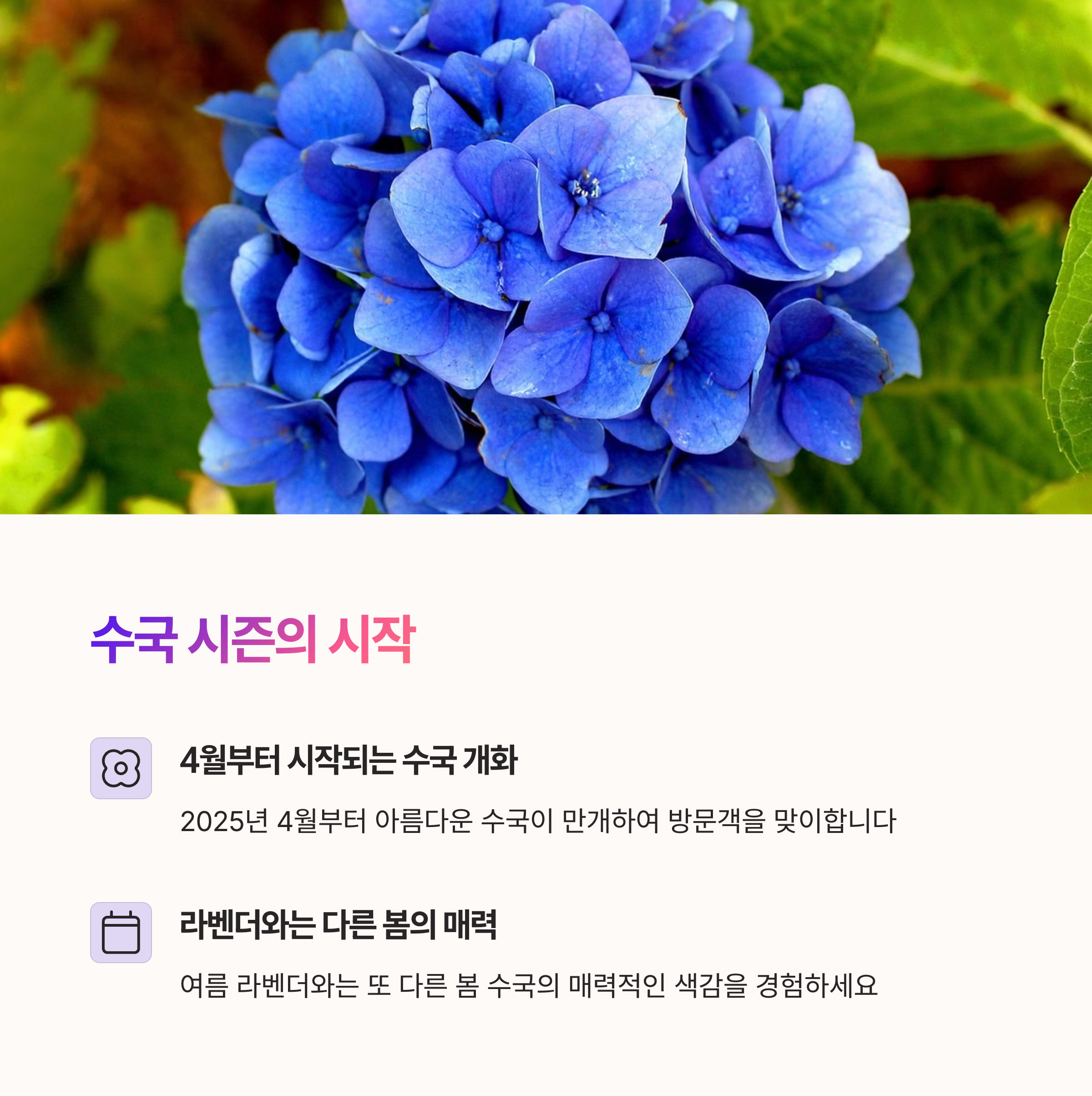 | 개화 시기 | 2025년 4월 첫 주부터 수국 정원 개방 |