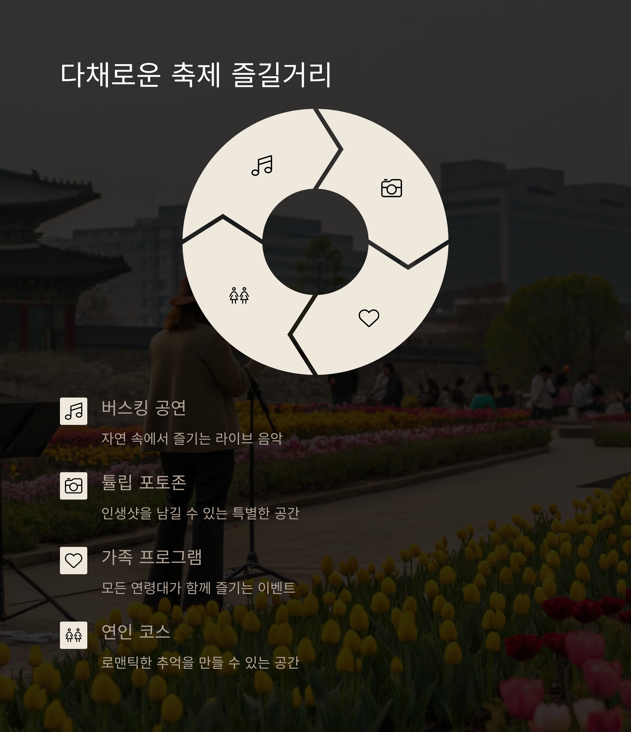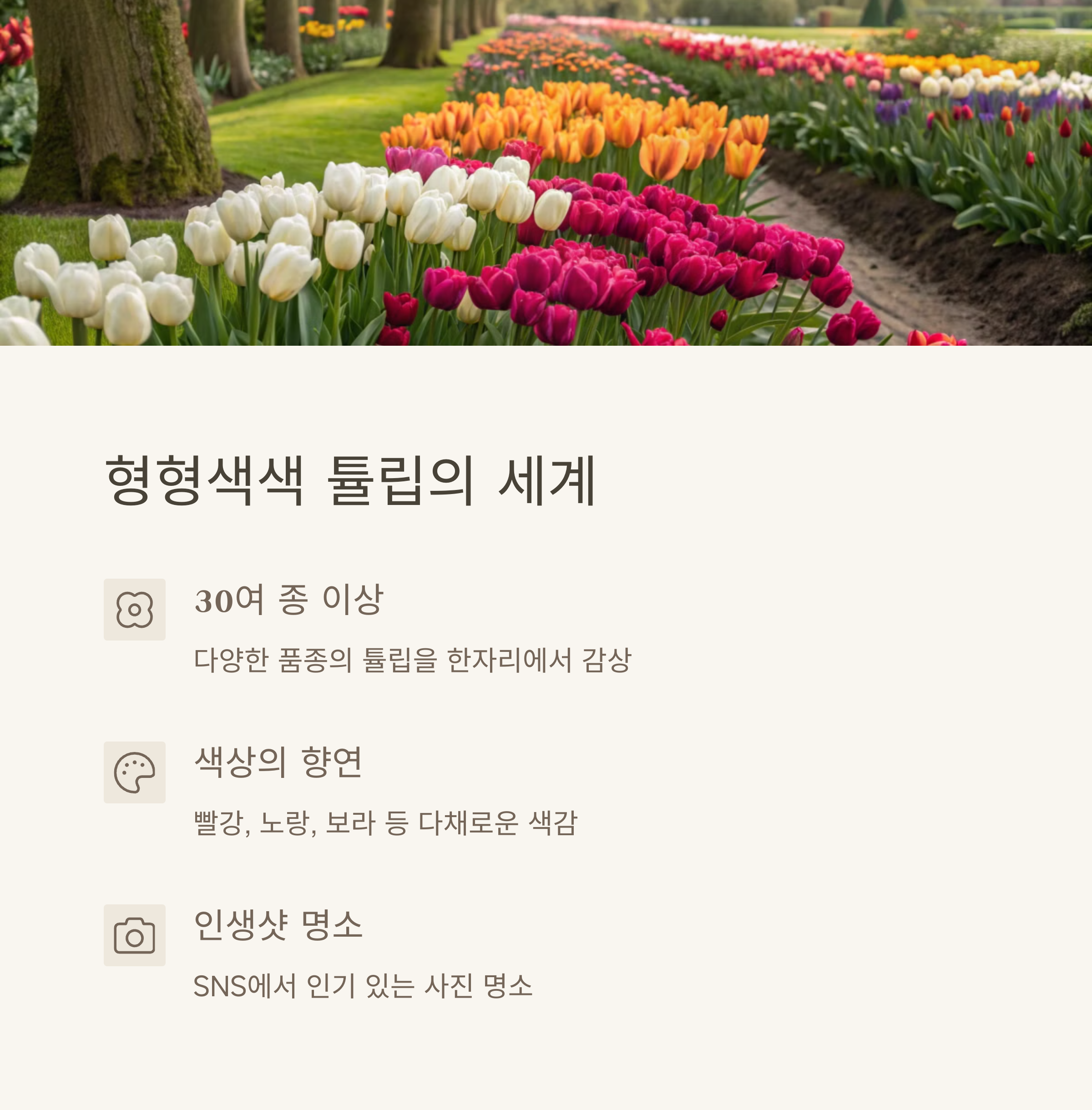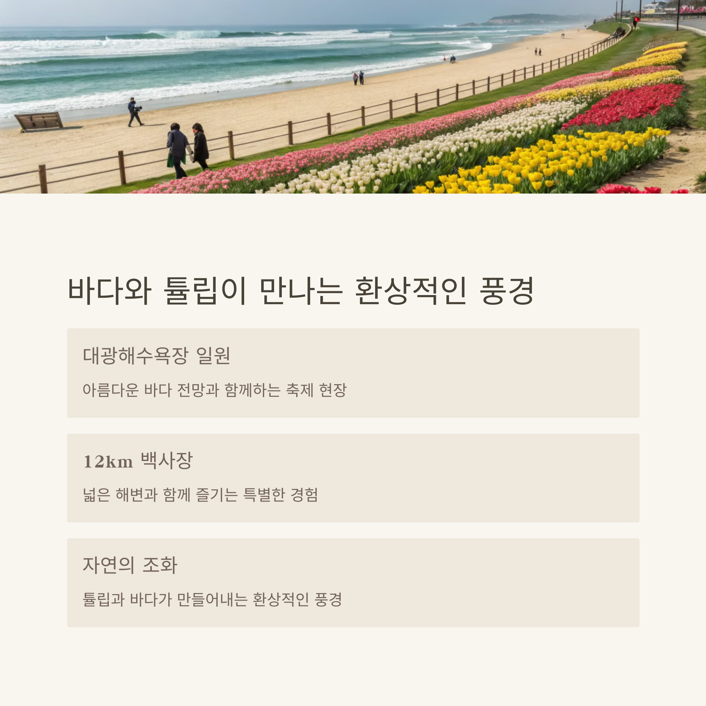 튤립을 배경으로 사진을 찍거나, 축제에서 마련한 다양한 체험 활동을 즐길 수도 있습니다. 봄철 가족 여행지로도 손색이 없는 곳이니 이번 기회에 방문해보세요!