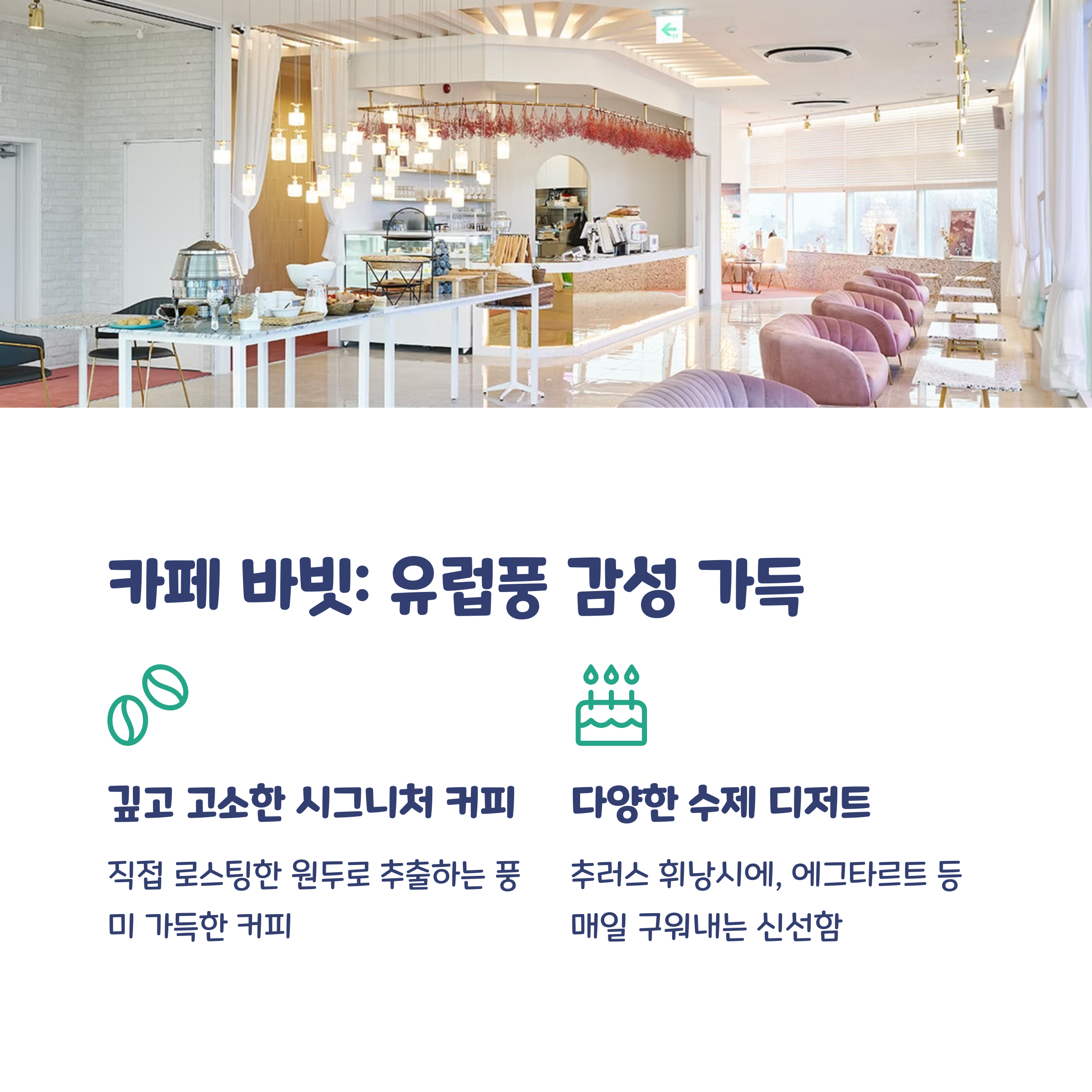 | 카페 바빗, 체이스커피 등 현지인 추천 맛집 | 미음카페, 크루아상과 베이글이 유명 | 엠클리프에서 감성 넘치는 풍경 감상 가능 |