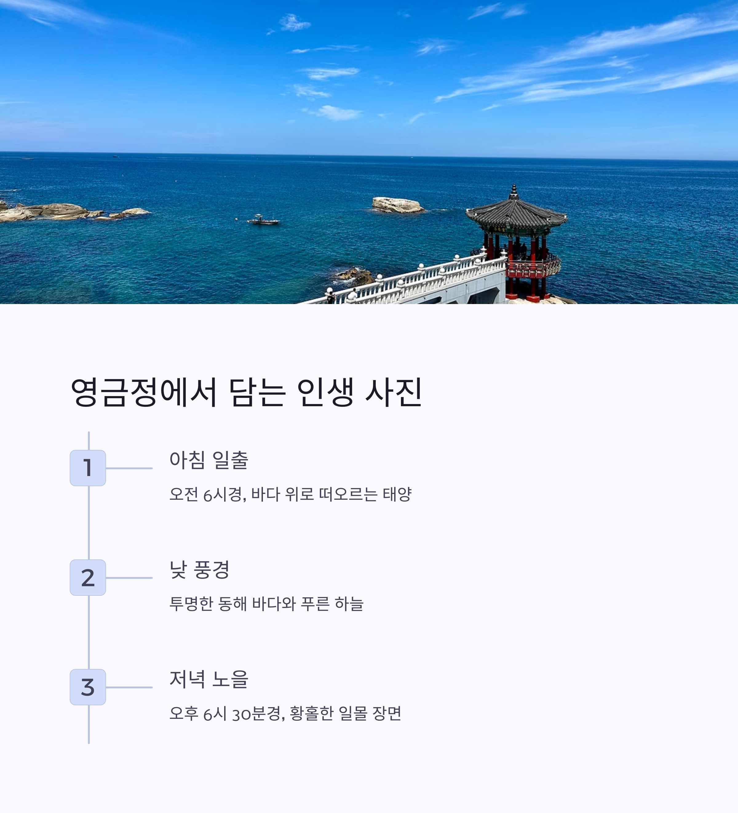 여행 후반에는 청초호수공원에서 여유를 즐기며 야경을 감상해보세요. 물안개 피는 호수 풍경은 몽환적이며, 데크 다리를 따라 걷다 보면 청초정에 이르게 됩니다. 그곳에서 바라보는 풍경은 카메라에 담기 전, 마음으로 먼저 감상하게 되는 특별함이 있습니다. 속초 중앙시장에서 닭강정이나 오징어순대를 맛보고, 영금정과 대포항에서 바다 위의 노을을 바라보며 하루를 마무리하면 완벽한 하루 코스가 완성됩니다.