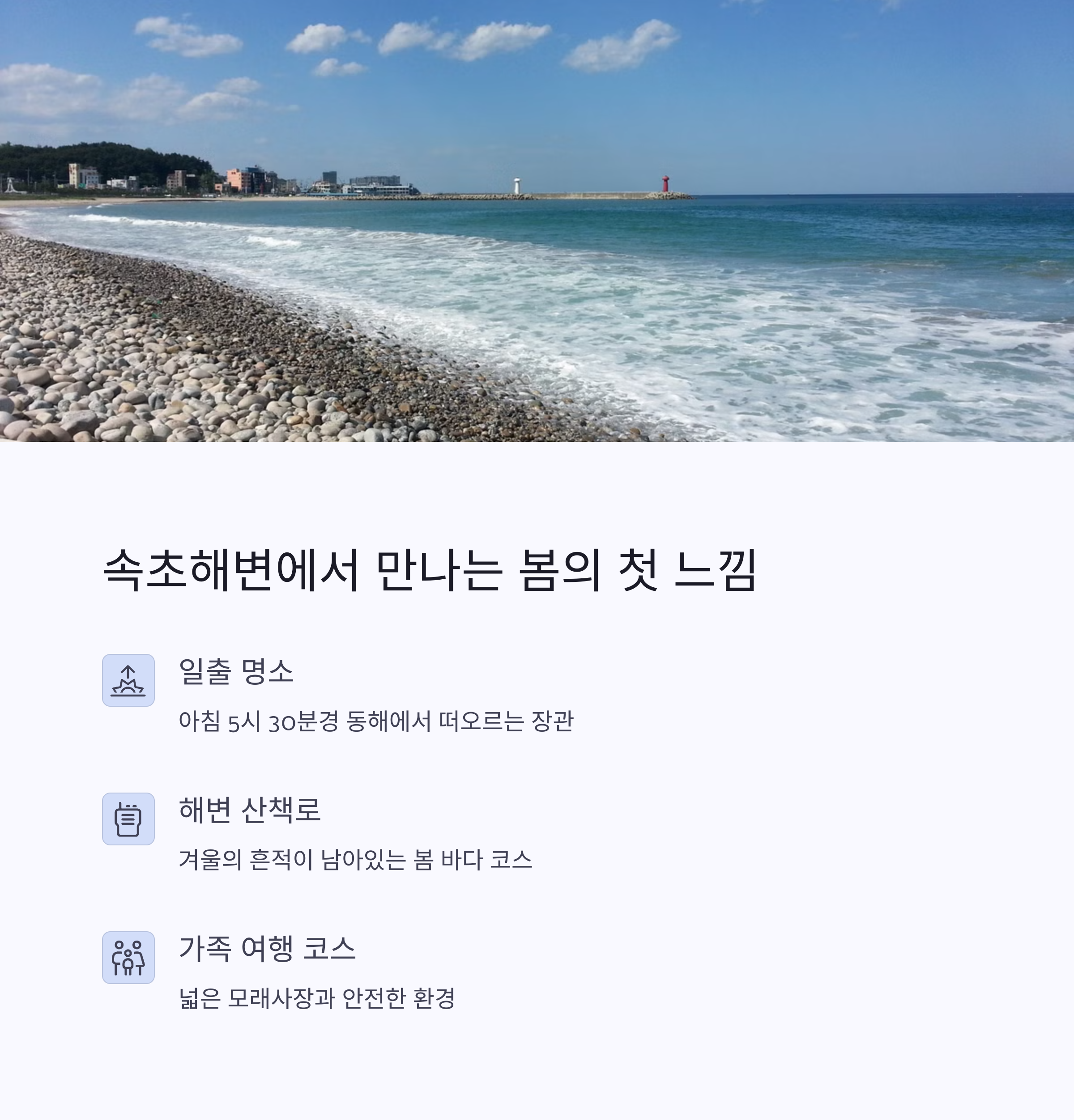 | 속초 여행의 특징 | 바다, 산, 시장을 모두 즐길 수 있는 종합 여행지 |