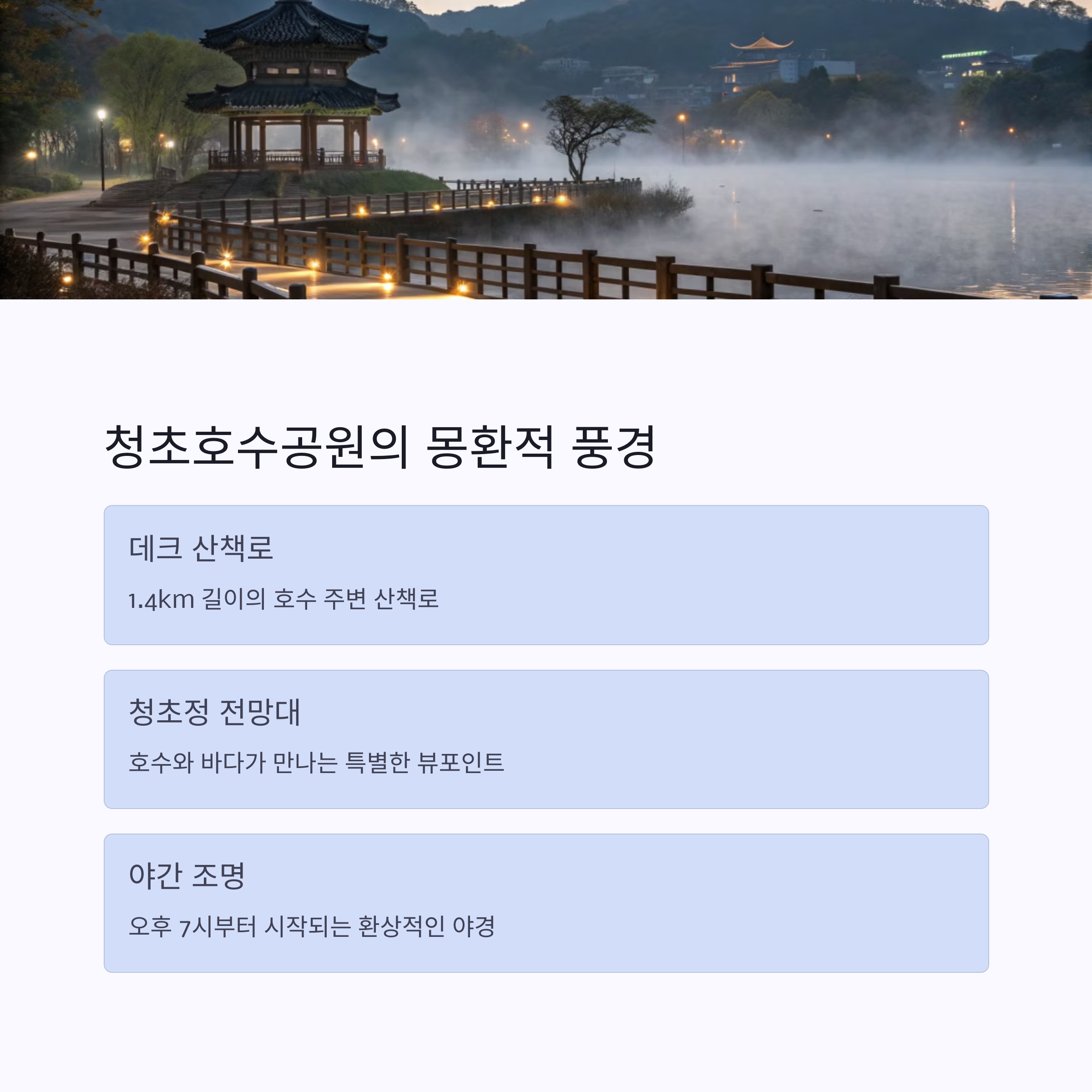 | 산책과 일출 감상으로 하루를 시작하기 좋은 장소 | 케이블카와 트레킹으로 자연을 온전히 느낄 수 있음 | 야경과 물안개가 아름다운 로맨틱 명소 |