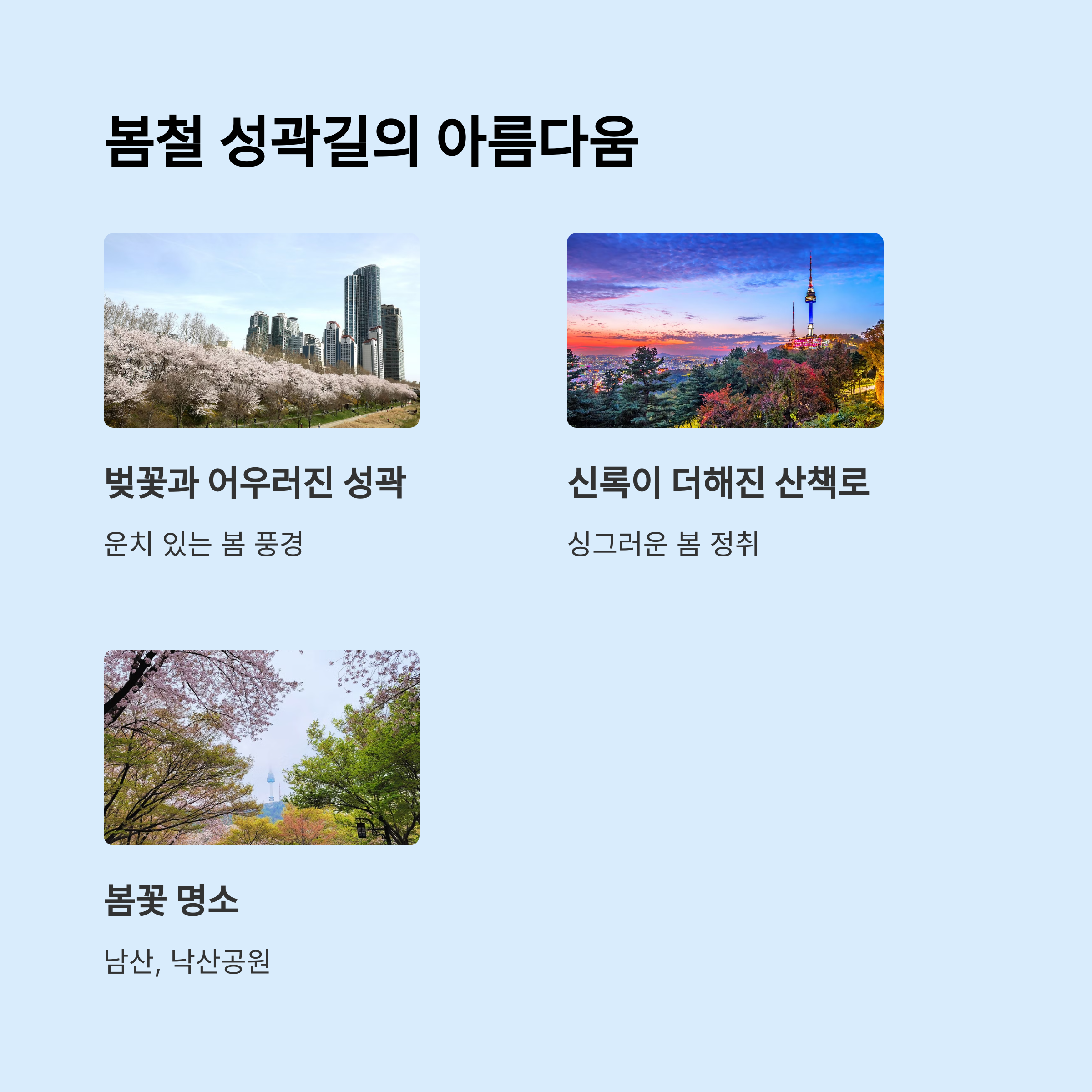 벚꽃 시즌에 특히 아름다운 코스 | 도심 속 힐링 산책 코스로 적합 | 한양도성 순성길의 대표적 명소 |