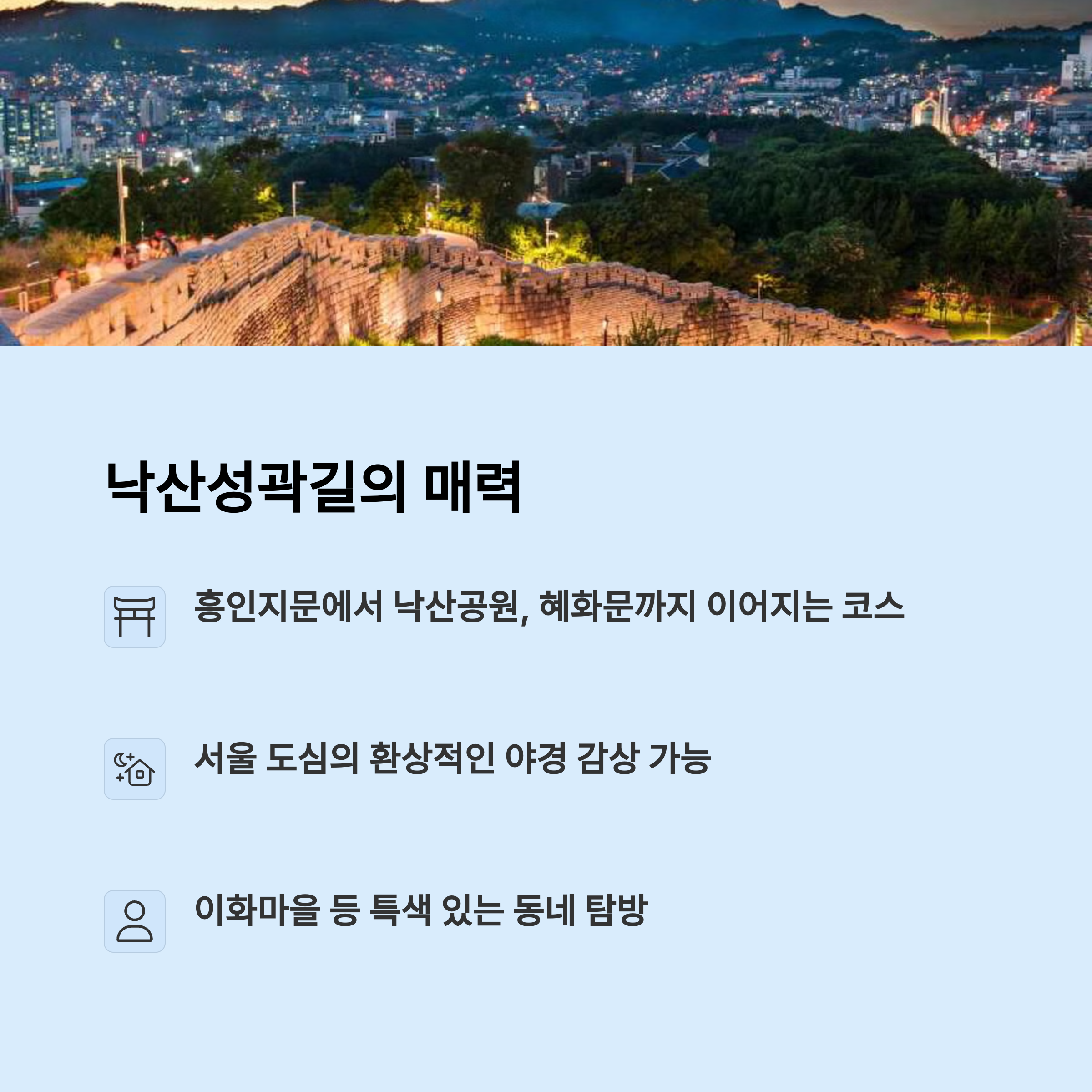 창의문에서 혜화문까지 이어지는 트레킹 | 서울 야경과 벚꽃을 동시에 즐길 수 있음 | 조선시대 성곽을 따라 도보 여행 가능 |