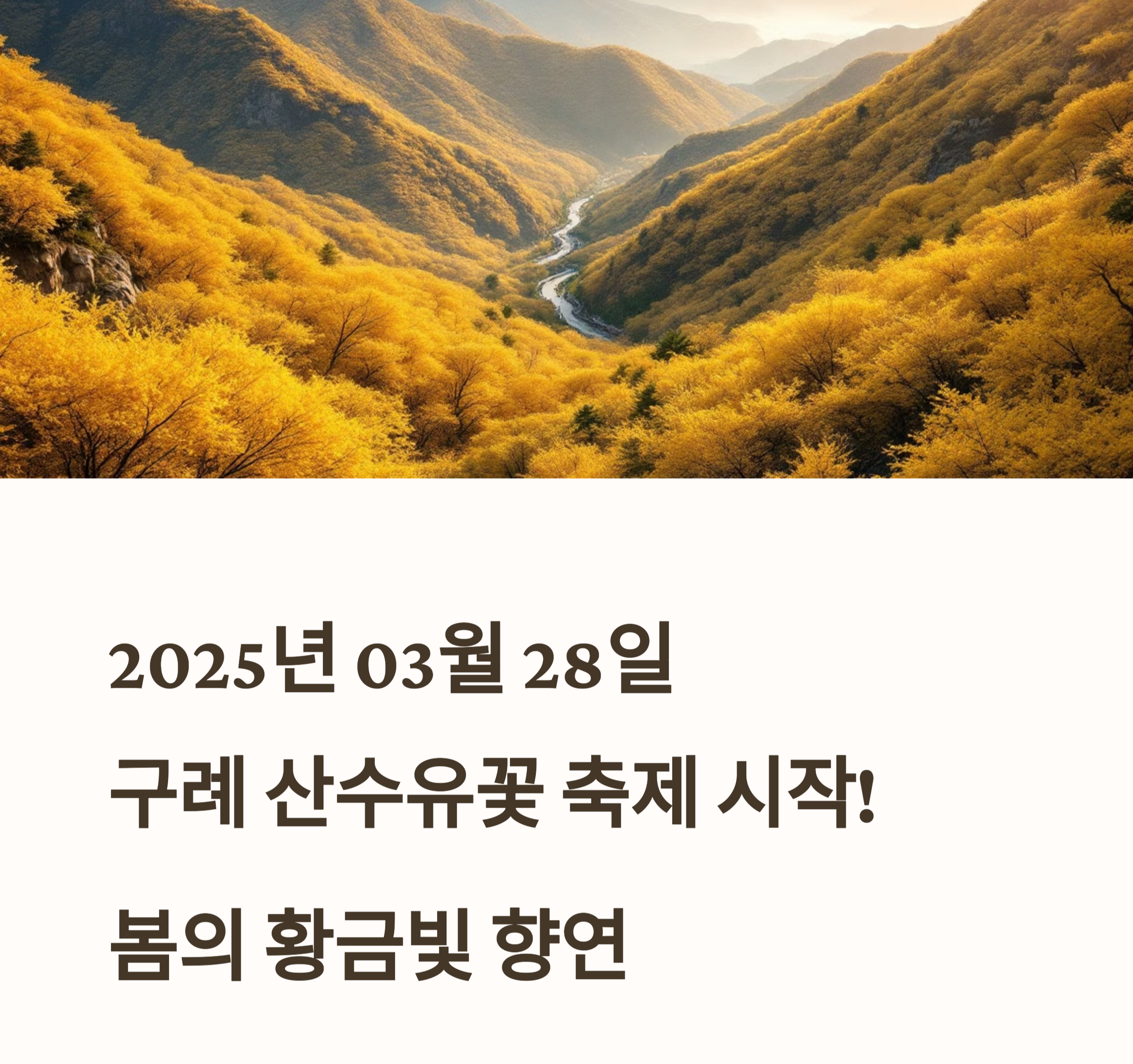 2025년 3월 28일, 아름다운 구례 산수유축제가 개최됩니다. 봄을 알리는 노란 산수유꽃이 지리산 자락을 가득 채우며, 환상적인 풍경 속에서 다채로운 체험을 즐길 수 있는 기회입니다.