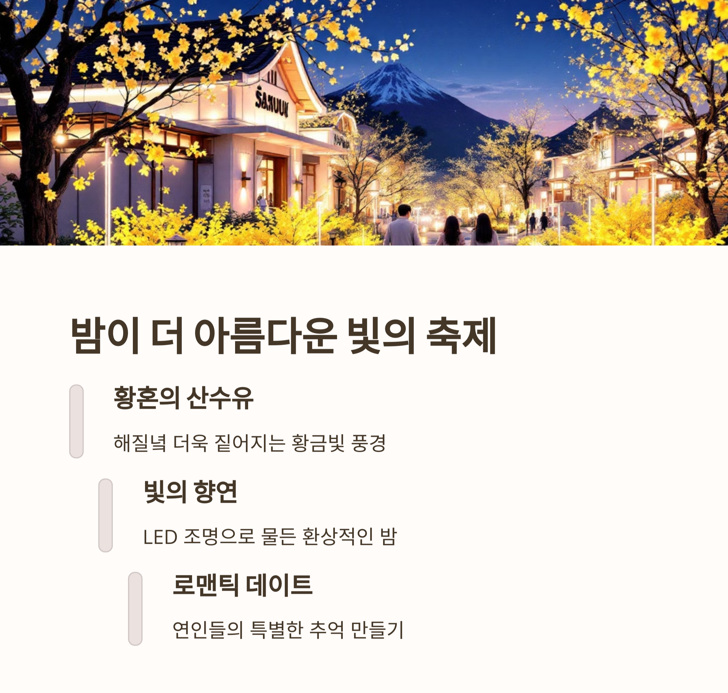 | 야간 조명 행사 | 화려한 조명 아래 더욱 빛나는 산수유꽃 |
