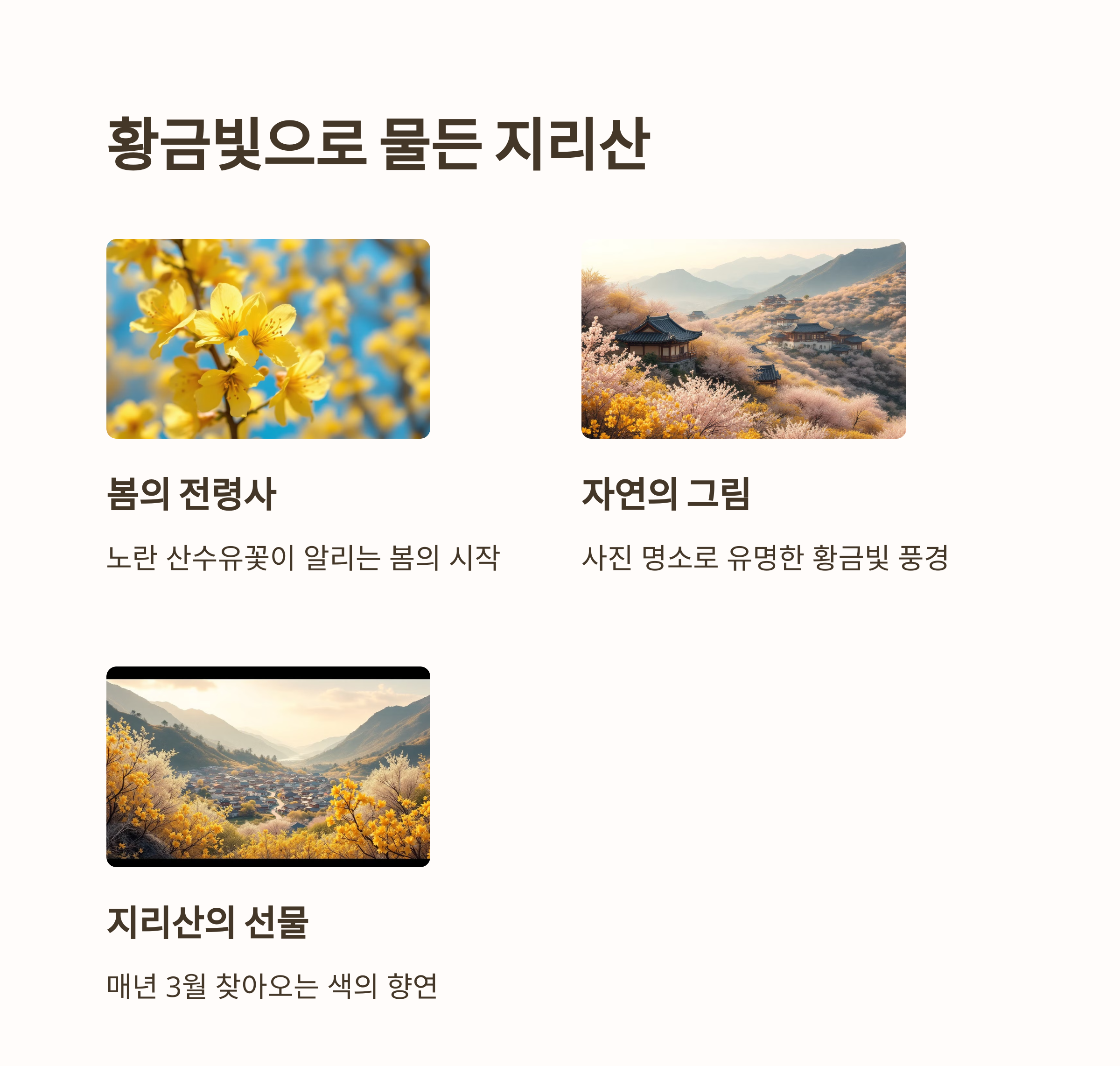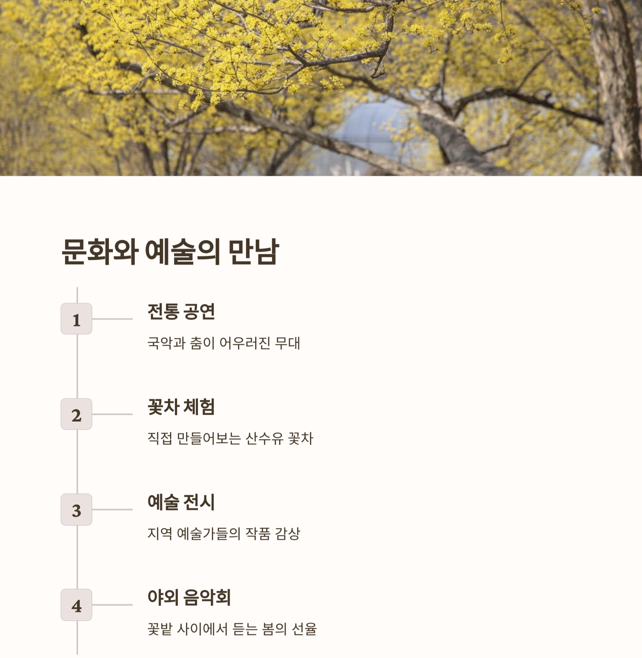 | 산수유꽃길 | 야간 조명 행사 | 전통놀이 체험 |
