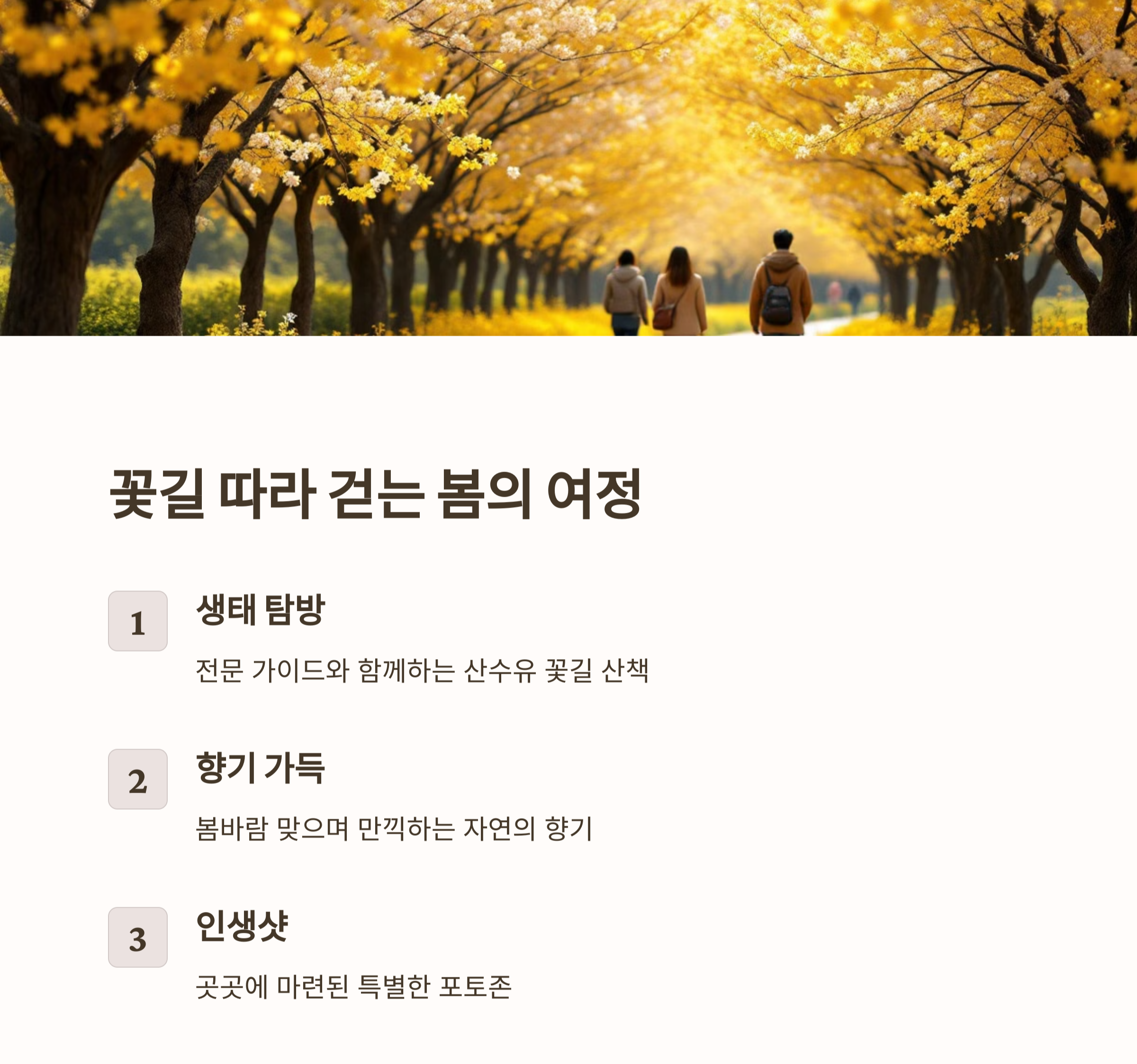 | 산수유꽃길 걷기 | 황금빛 꽃길을 따라 걸으며 봄 정취 느끼기 |