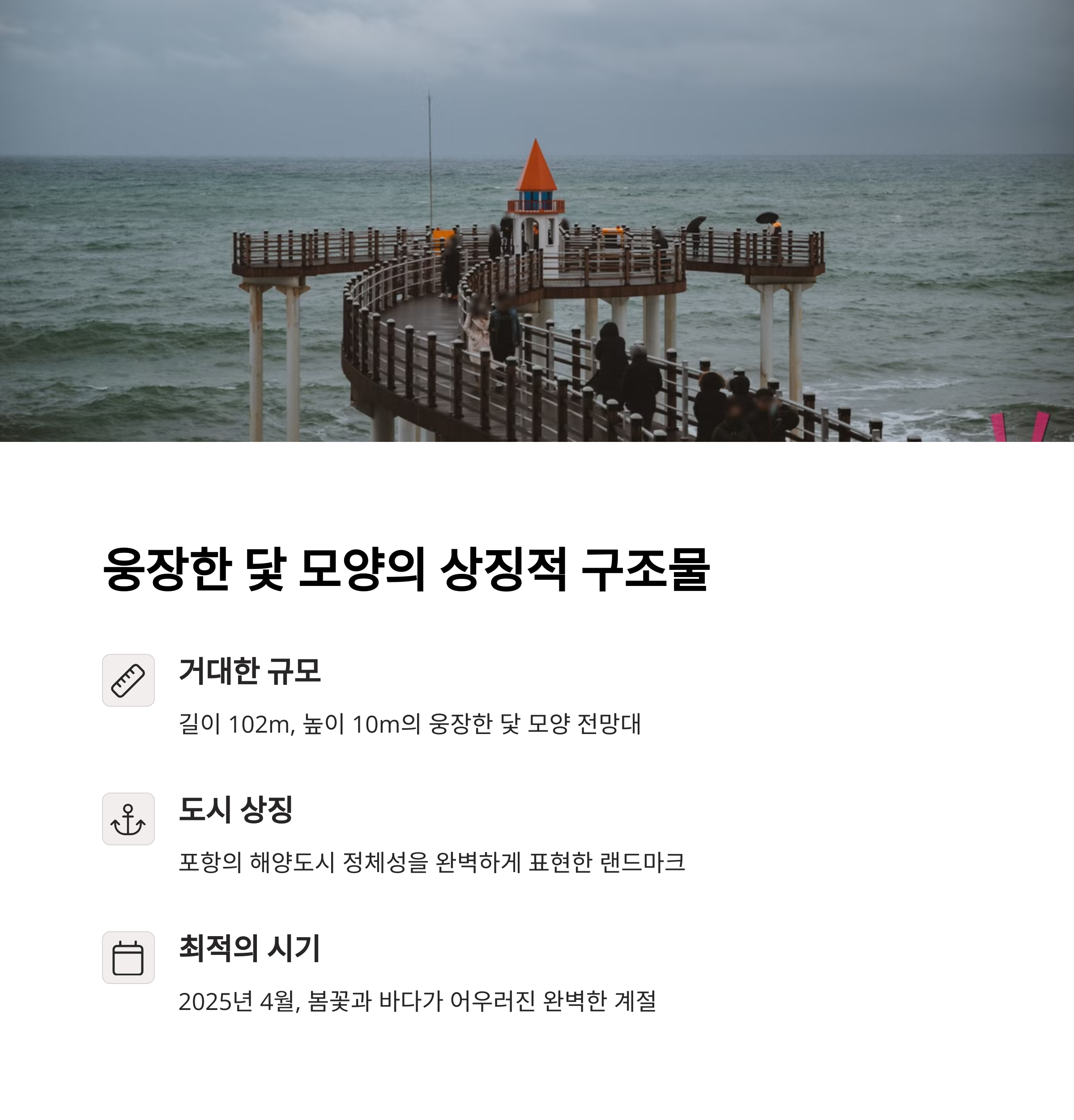 | 위치 및 구조 | 포항 이가리 해변, 길이 102m·높이 10m 닻 형 전망대 |