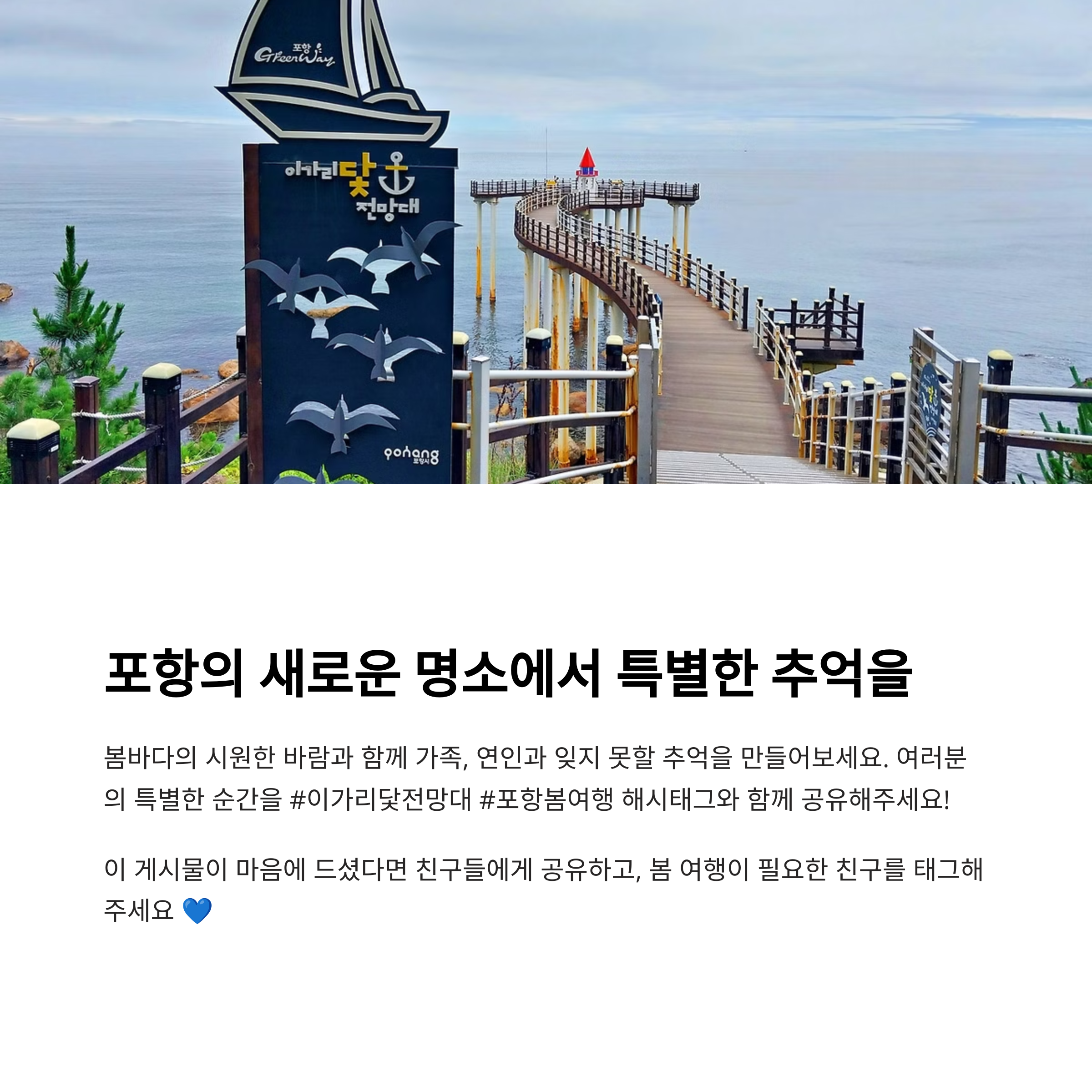 따스한 봄볕과 시원한 바닷바람을 동시에 느낄 수 있는 곳, 포항 이가리 닻 전망대는 2025년 4월, 여행자들의 발걸음을 이끄는 봄바다 명소로 떠오르고 있습니다. 길이 102m, 높이 10m의 닻 모양 전망대는 포항의 해양도시 정체성을 상징하며, 그 위에 서면 수평선 너머 동해의 푸른 바다와 울창한 해송 숲이 한눈에 펼쳐집니다. 특히 벚꽃이 피는 4월에는 분홍빛 꽃잎과 바다의 푸름이 어우러져 감성적인 풍경을 만들어냅니다. 지금, 포항 바다의 봄을 만나보세요.