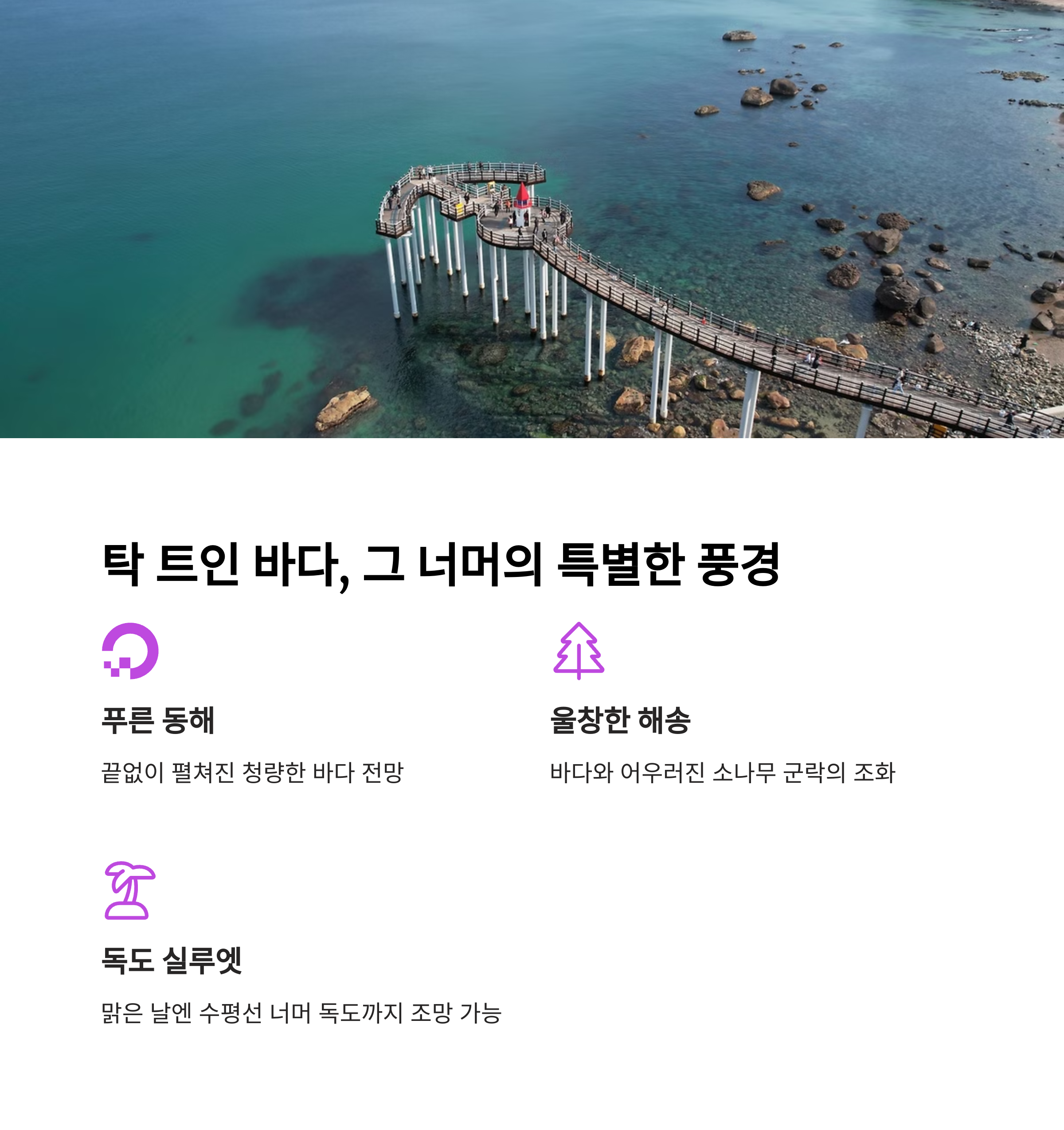 4월의 전망대 주변은 벚꽃을 비롯해 각종 봄꽃들이 만개하여 푸른 바다와 꽃길이 조화를 이루는 인생 사진 명소로 인기입니다. 운이 좋다면 독도 실루엣까지 확인할 수 있어 의미 있는 관광 코스로도 추천되며, 국민적 상징성과 풍경미를 동시에 만족시켜줍니다. 자연을 있는 그대로 보존한 산책로와 해변은 사진뿐 아니라 마음까지 힐링되는 봄 여행지로 제격입니다.