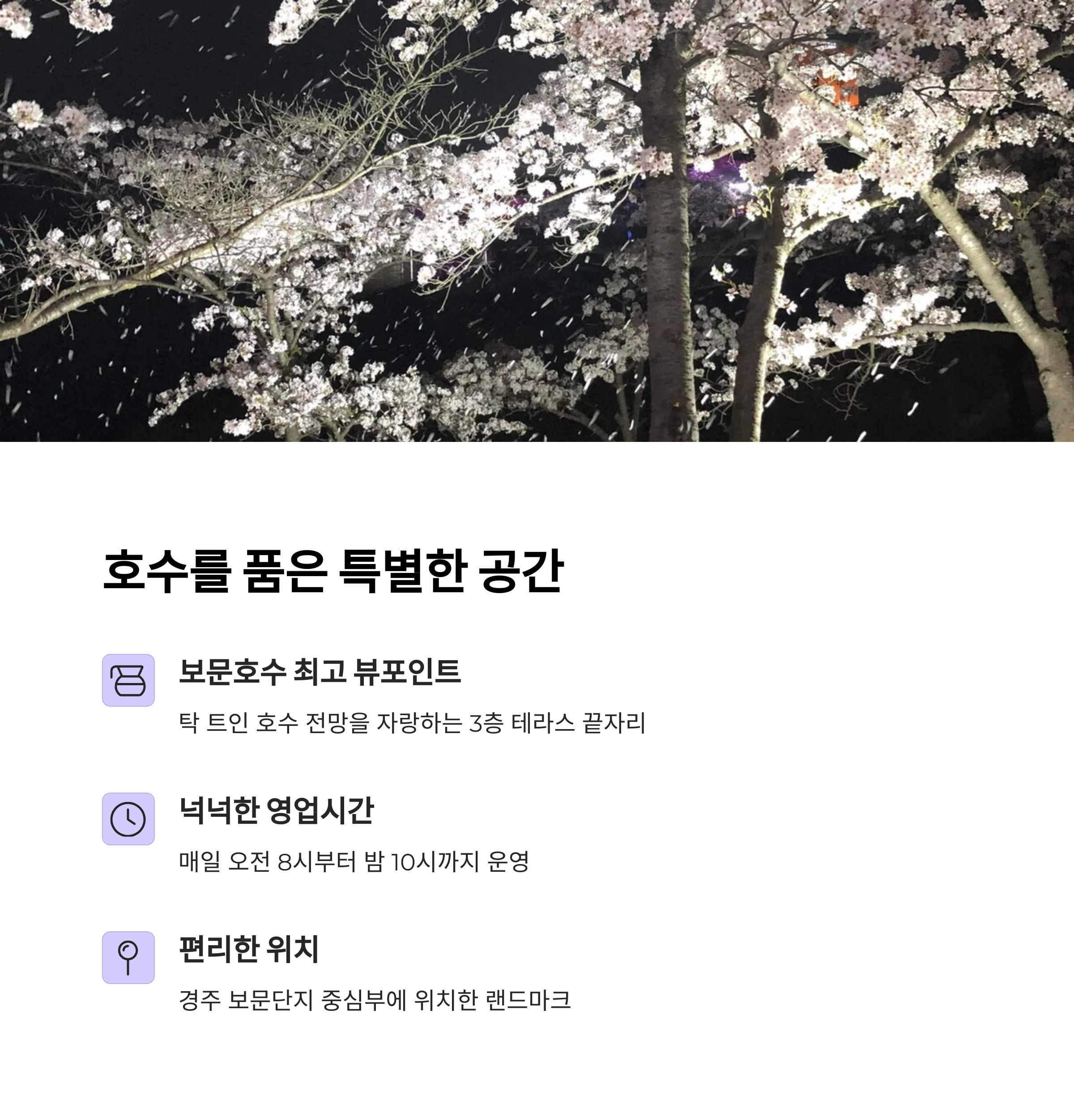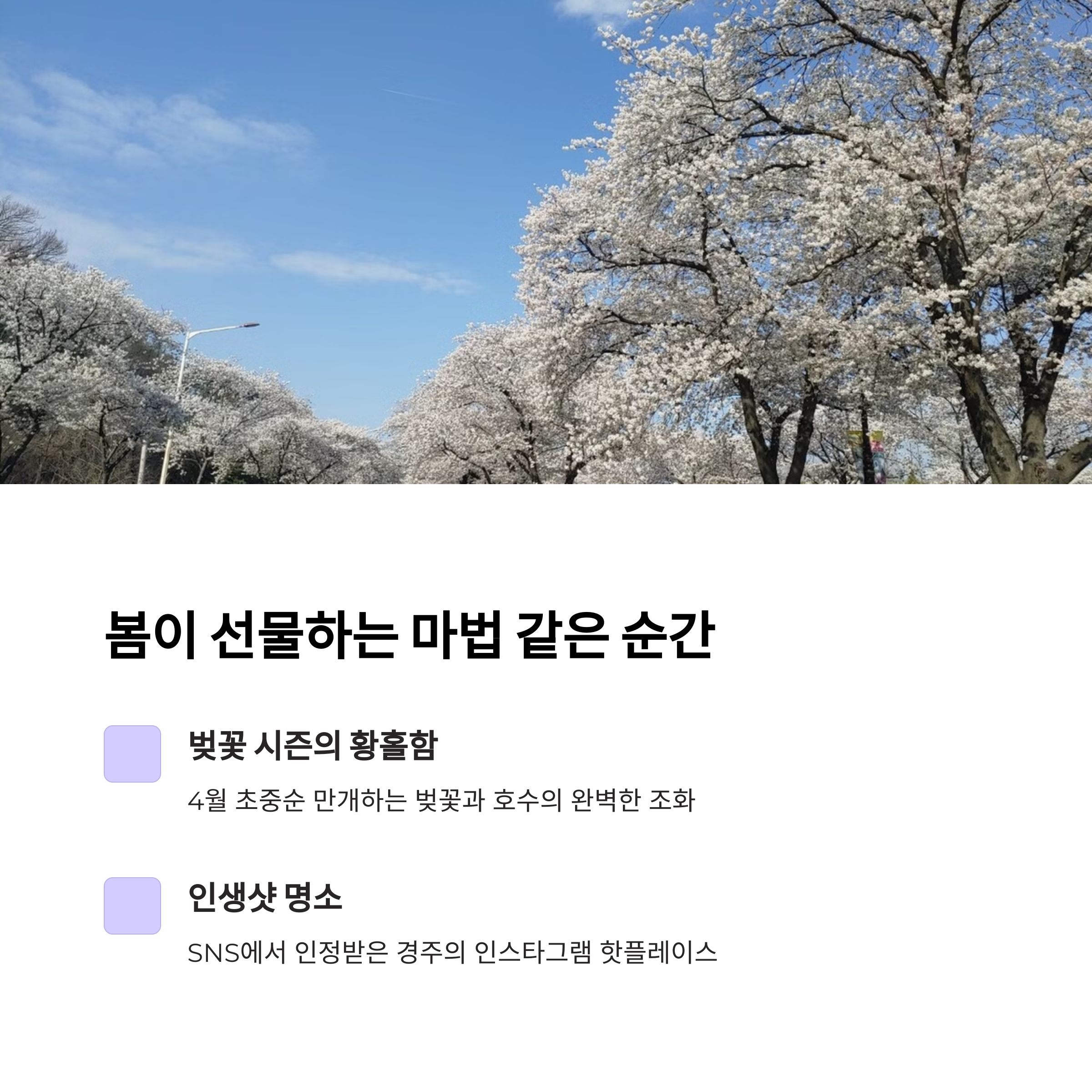 | 벚꽃 시즌에 더욱 아름다운 풍경 | 커피+경주 특산 굿즈까지 즐기기 | 가족·연인과 여유로운 봄 산책 코스 |