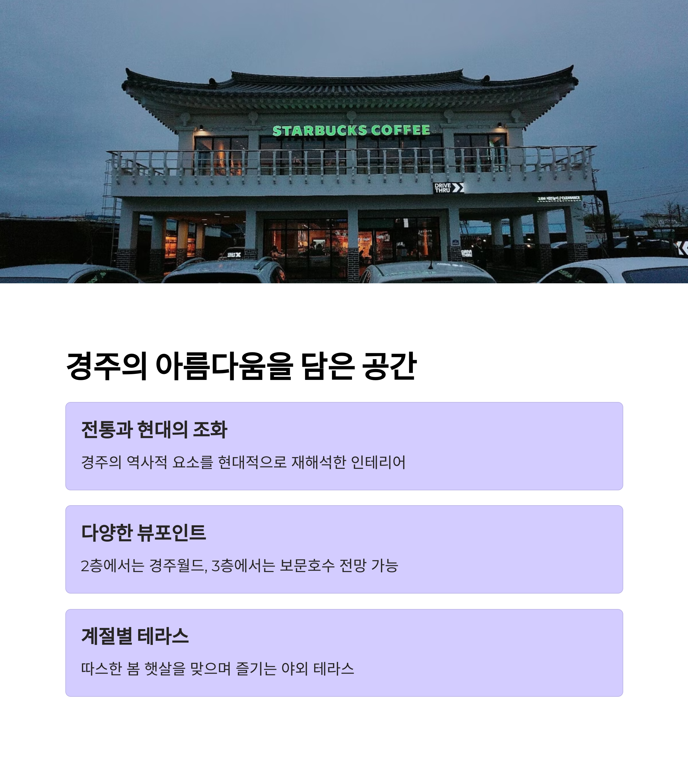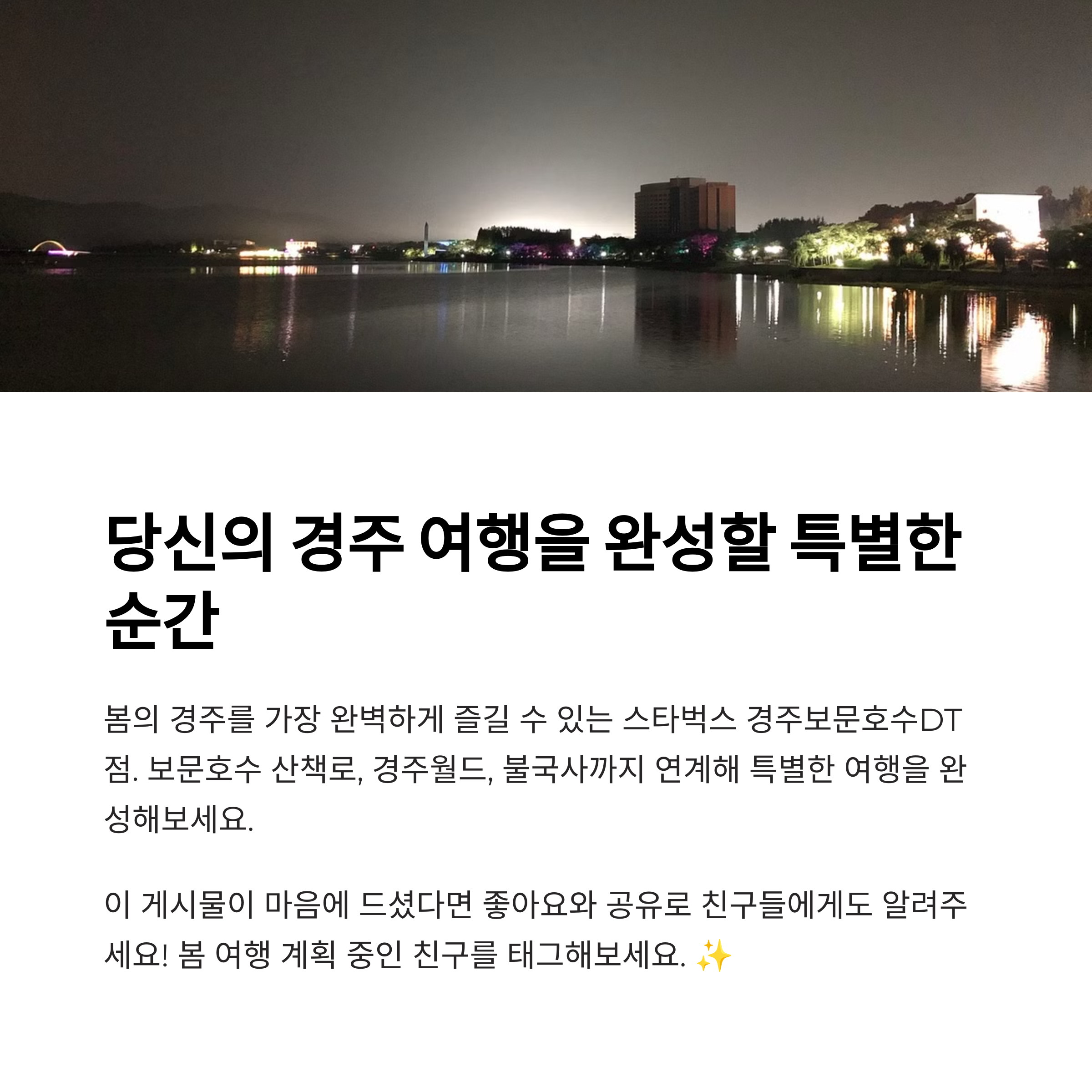 경주 보문단지 스타벅스는 단순한 카페가 아닙니다. 그곳에는 자연과 여유, 그리고 감성 가득한 봄의 기억이 함께 존재합니다. 햇살 좋은 봄날, 커피 한 잔을 들고 호수를 바라보며 천천히 걷는 그 순간은 분주한 일상 속에서 찾기 어려운 선물입니다. 올해 봄, 벚꽃과 호수를 동시에 즐기고 싶다면 보문호수 스타벅스에서의 하루를 꼭 추천드립니다.