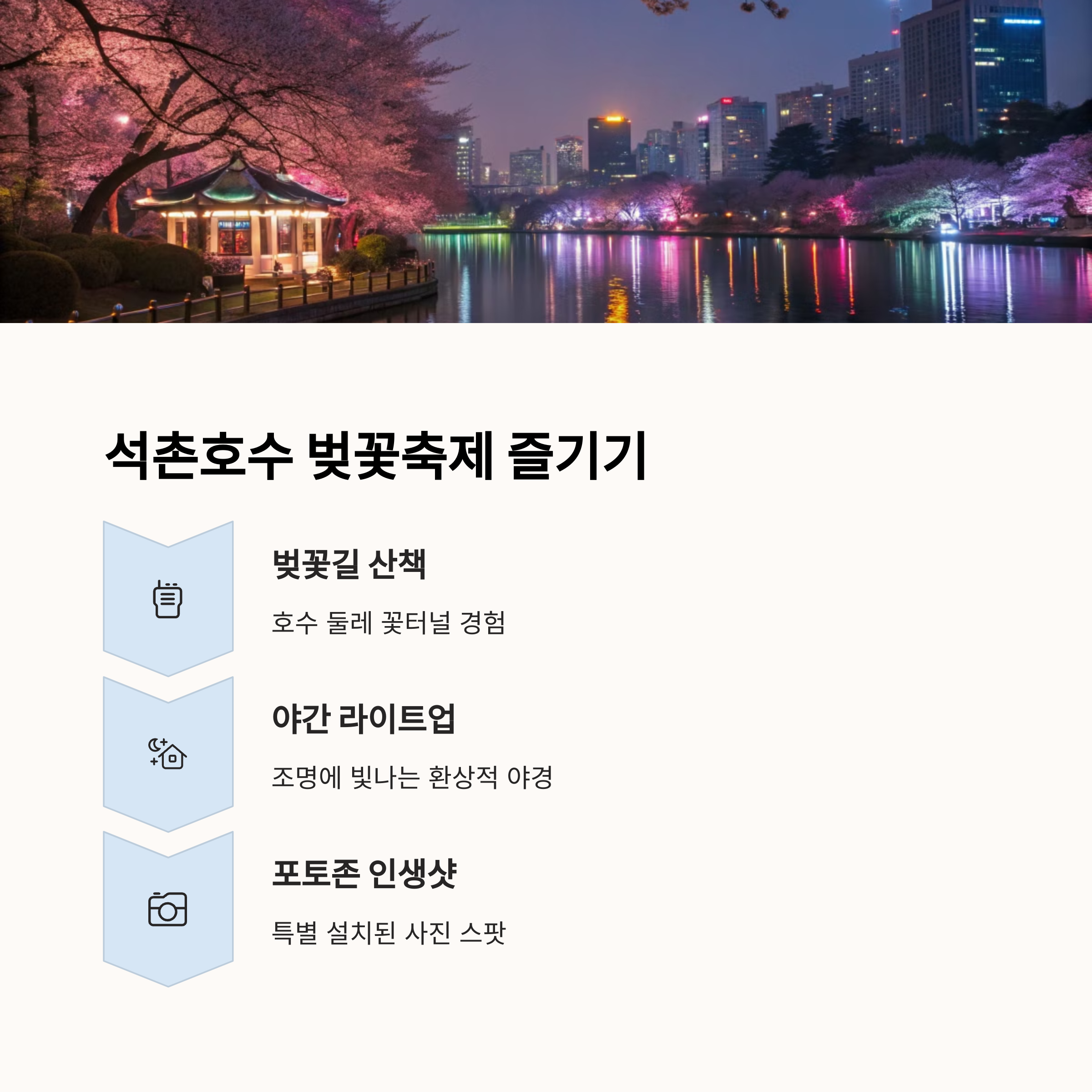 벚꽃을 감상하는 것뿐만 아니라 **야경 산책, 포토존, 길거리 음식, 지역 특산품 체험**을 놓치지 마세요! 특히 **서울 여의도 봄꽃축제**에서는 야간 조명과 함께 벚꽃을 감상할 수 있어 더욱 로맨틱합니다.