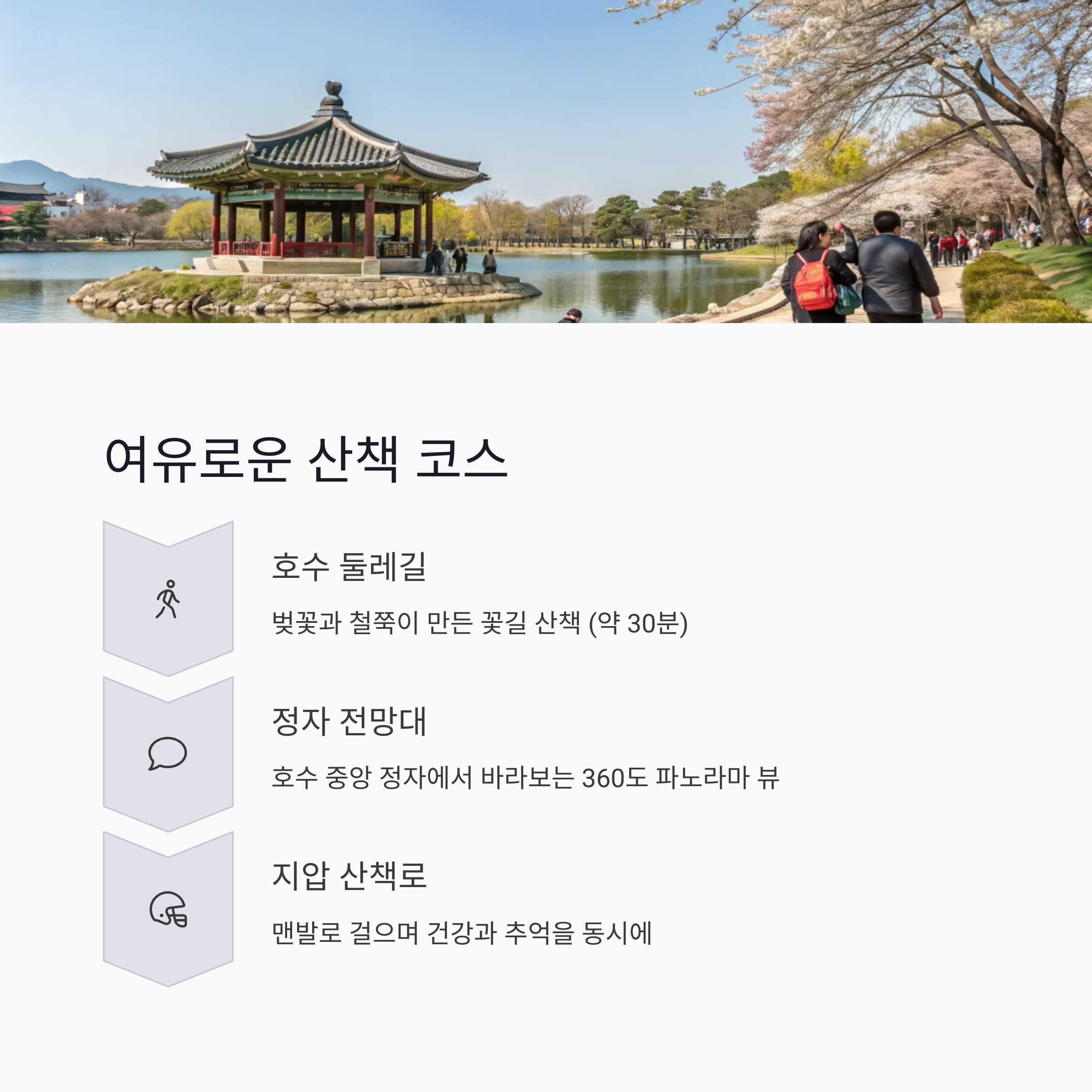 | 특징 | 벚꽃과 철쭉이 어우러진 호수 둘레길, 정자와 분수대가 조성된 공원 |