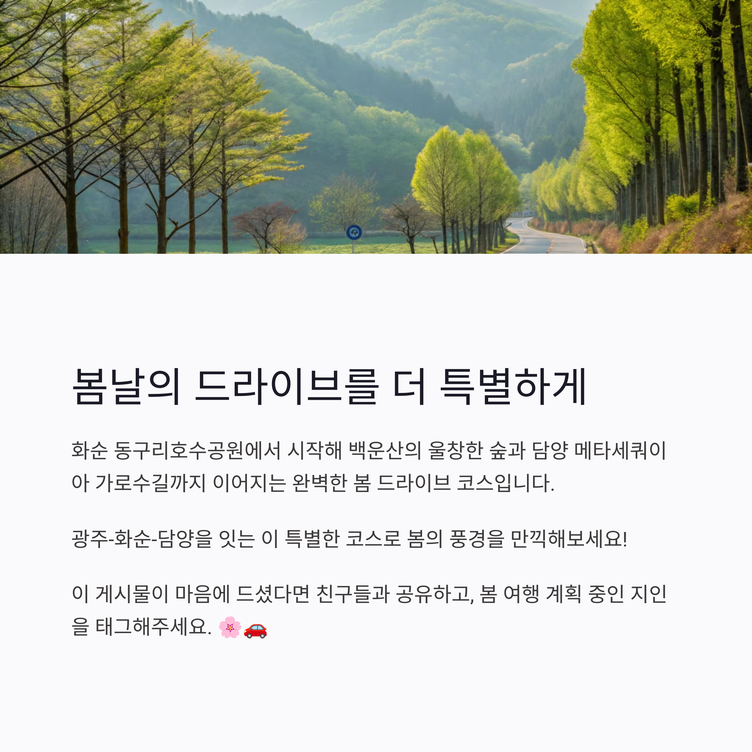1️⃣ **동구리호수공원 산책**: 벚꽃과 철쭉을 감상하며 호수 둘레길을 걸어보세요. 2️⃣ **근처 맛집 방문**: 화순읍의 '불타는 용궁짬뽕'에서 해물 짬뽕을 맛보세요. 3️⃣ **드라이브 코스 연계**: 화순 백운산이나 담양 메타세쿼이아 길까지 드라이브하며 더 넓은 풍경을 즐겨보세요. 이 코스를 따라 여행하면 광주 근교에서 **최고의 봄날**을 경험할 수 있습니다.