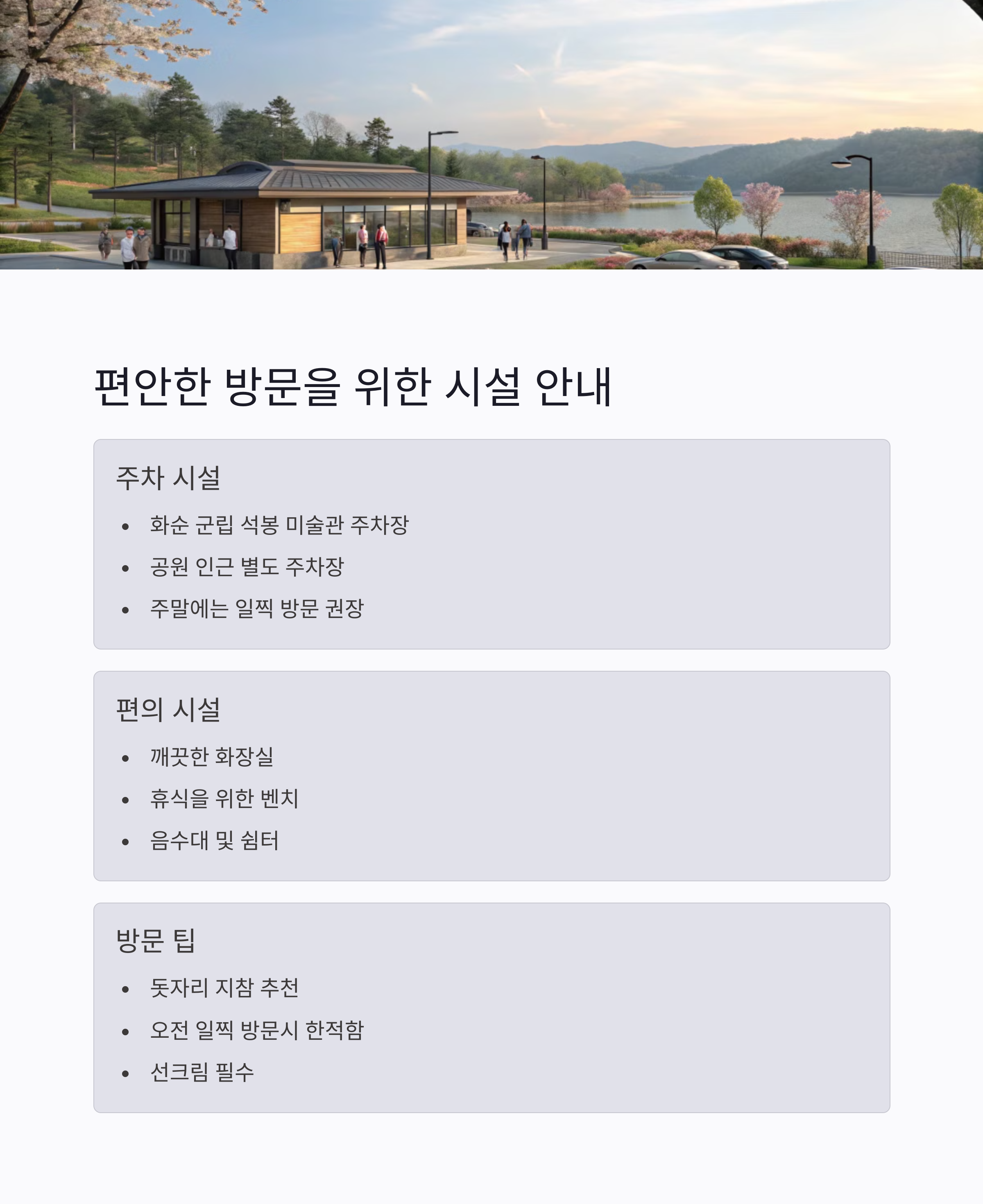 | 주차 | 화순 군립 석봉 미술관 주차장 및 공원 근처 주차장 이용 가능 |