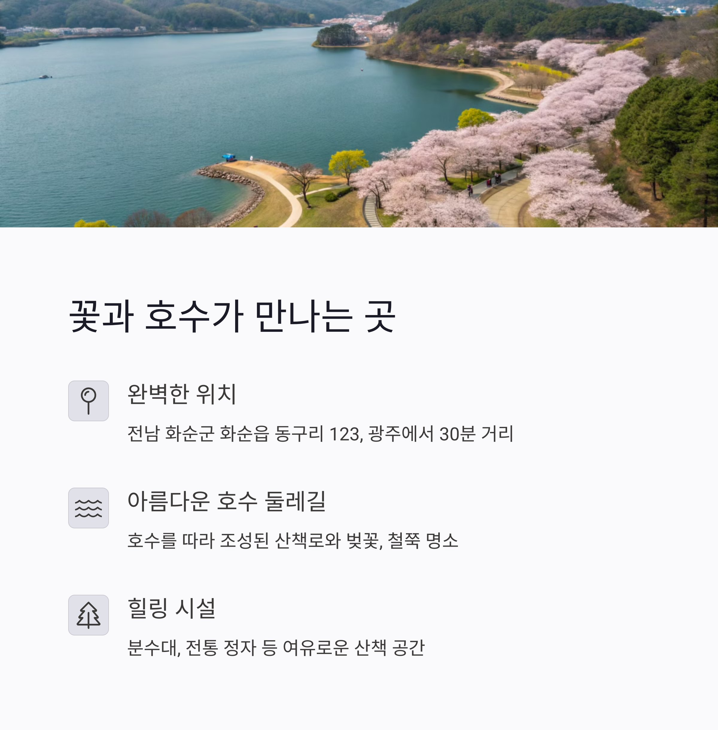 화순 동구리호수공원에 가보신 적이 있나요? 혹은 광주 근교에서 추천하고 싶은 다른 벚꽃 명소가 있다면 댓글로 공유해주세요! 여러분의 소중한 의견을 기다립니다. 😊
