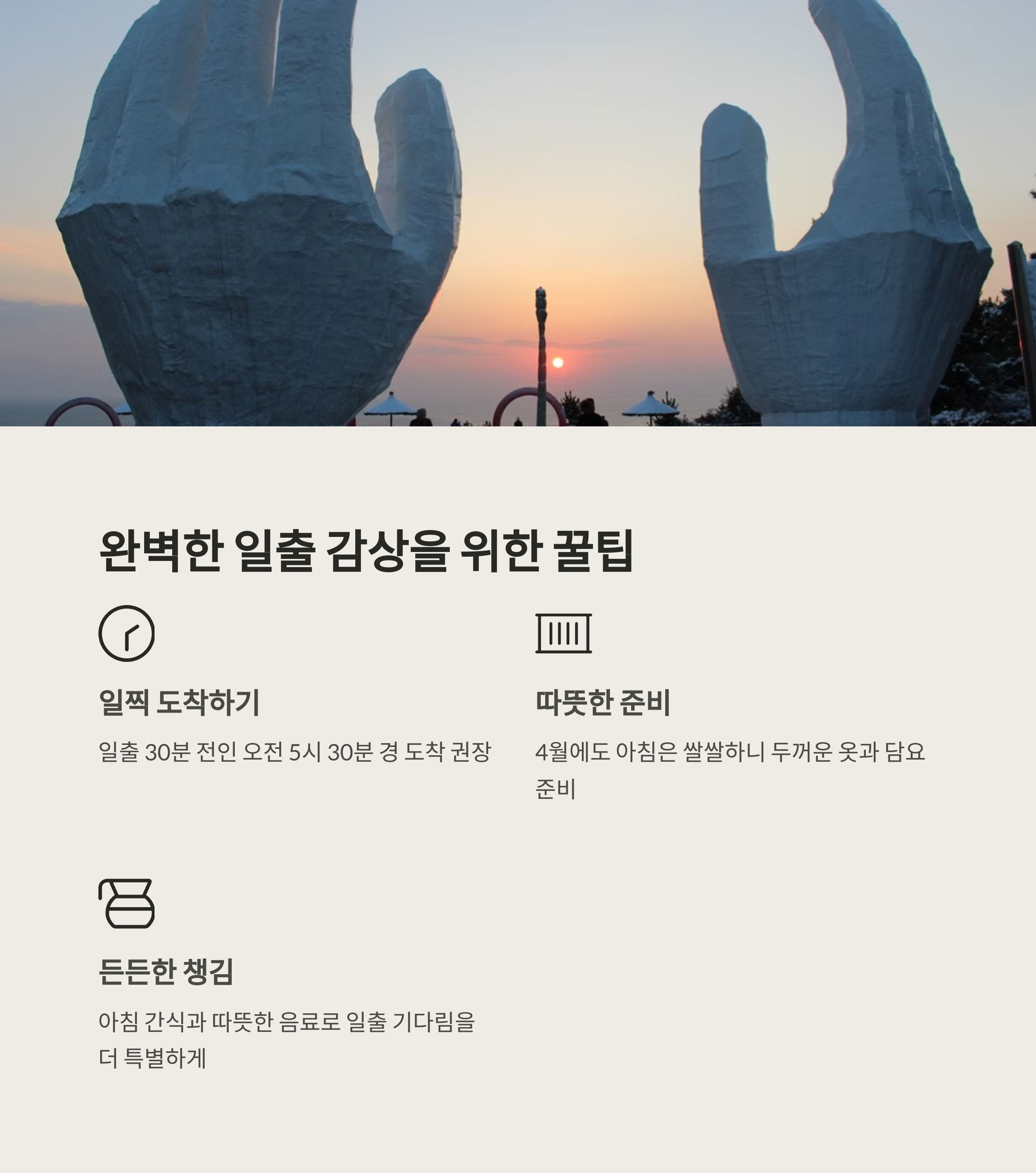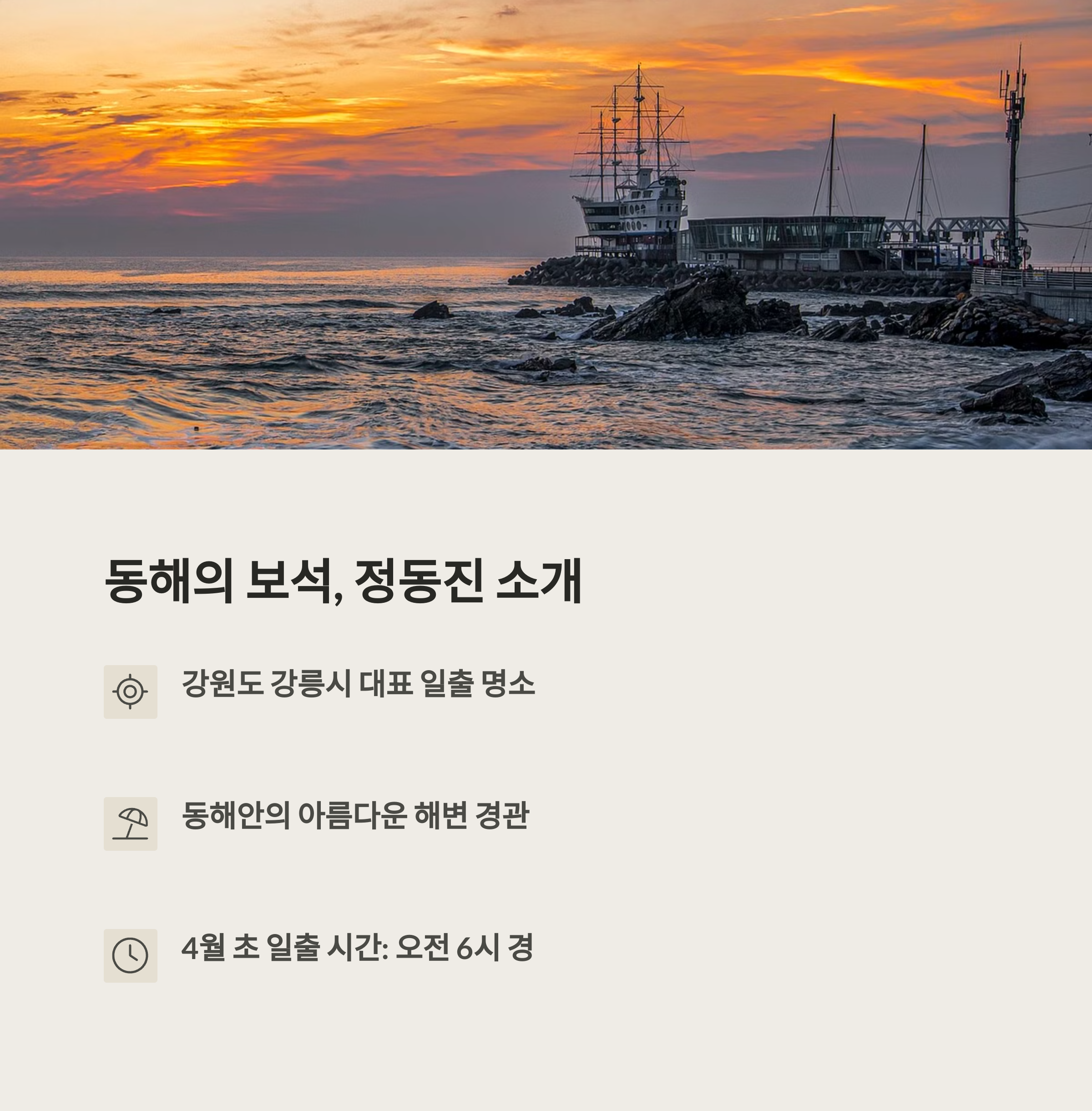 | 정동진 일출 시간 | 오전 6시경으로 30분 전 도착 추천 |