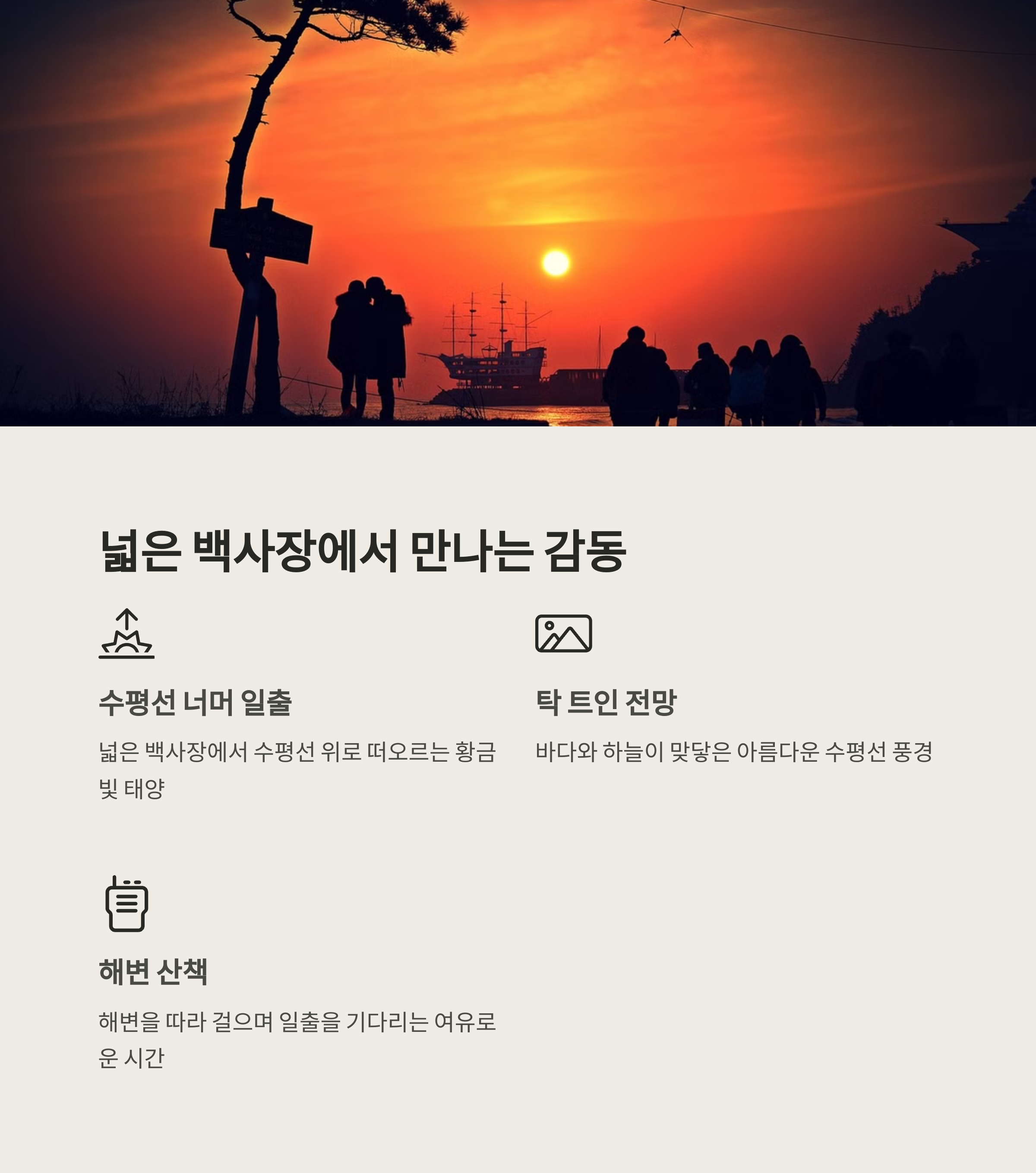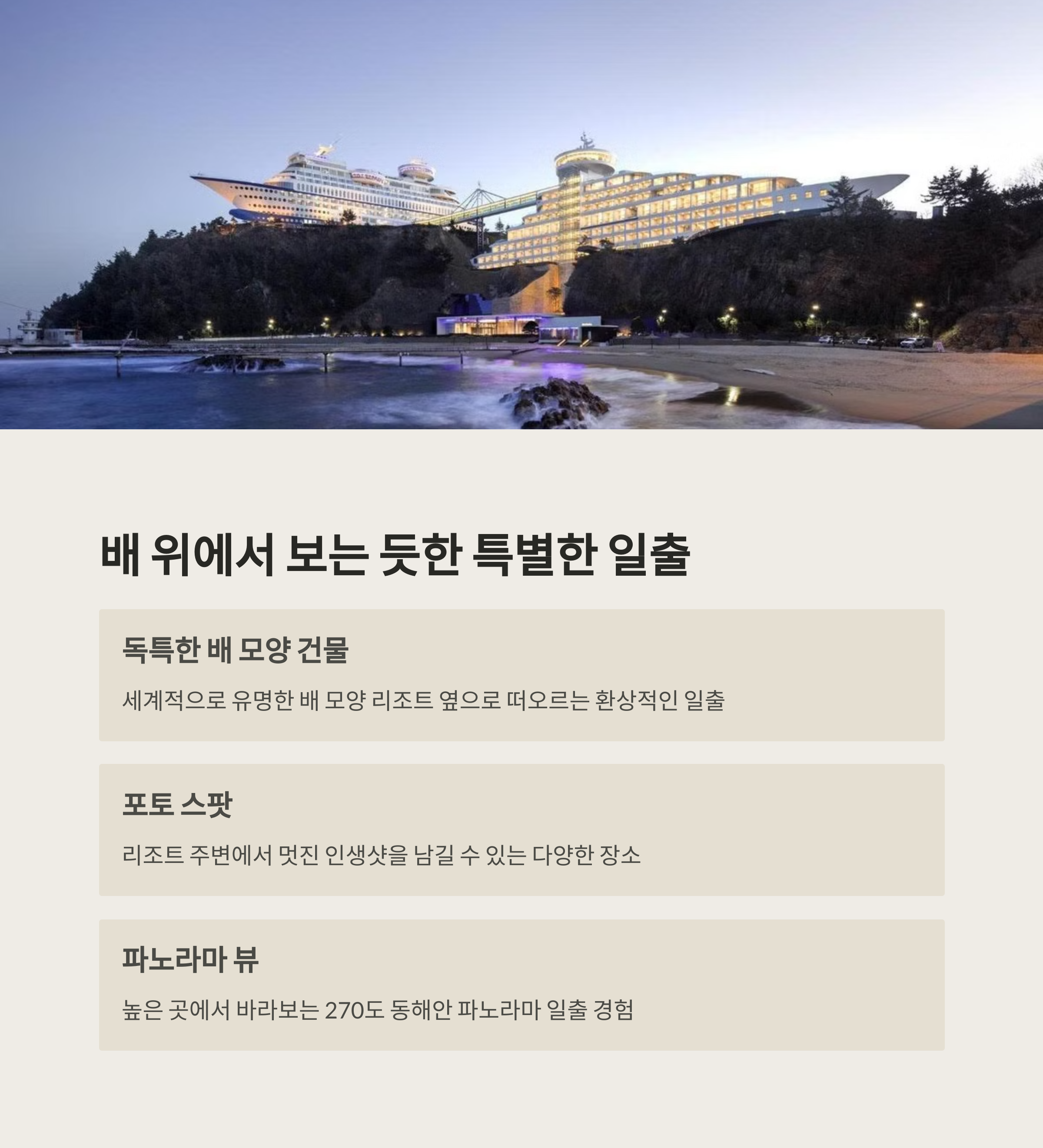 | 백사장에서 수평선 일출 감상 | 배 모양 구조에서의 이색 일출 체험 | 조각상과 함께하는 낭만적인 분위기 |