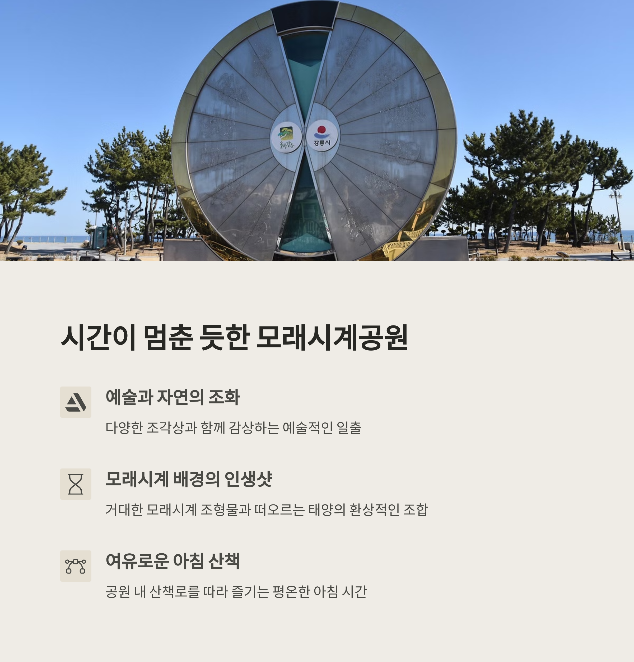 정동진의 일출은 단순한 자연 현상을 넘어 마음을 비우고 새로운 하루를 시작하게 해주는 깊은 감동을 선사합니다. 특히 4월의 정동진은 바람도, 공기도 어느 하나 거슬리는 것 없이 평온하며 가족, 연인, 친구 누구와 함께해도 좋은 추억을 남길 수 있는 장소입니다. 이 글을 통해 여러분의 일출 여행이 조금이라도 더 즐겁고 편안해졌다면 기쁩니다. 안전하고 감동적인 새벽 여행 되시길 바랍니다.
