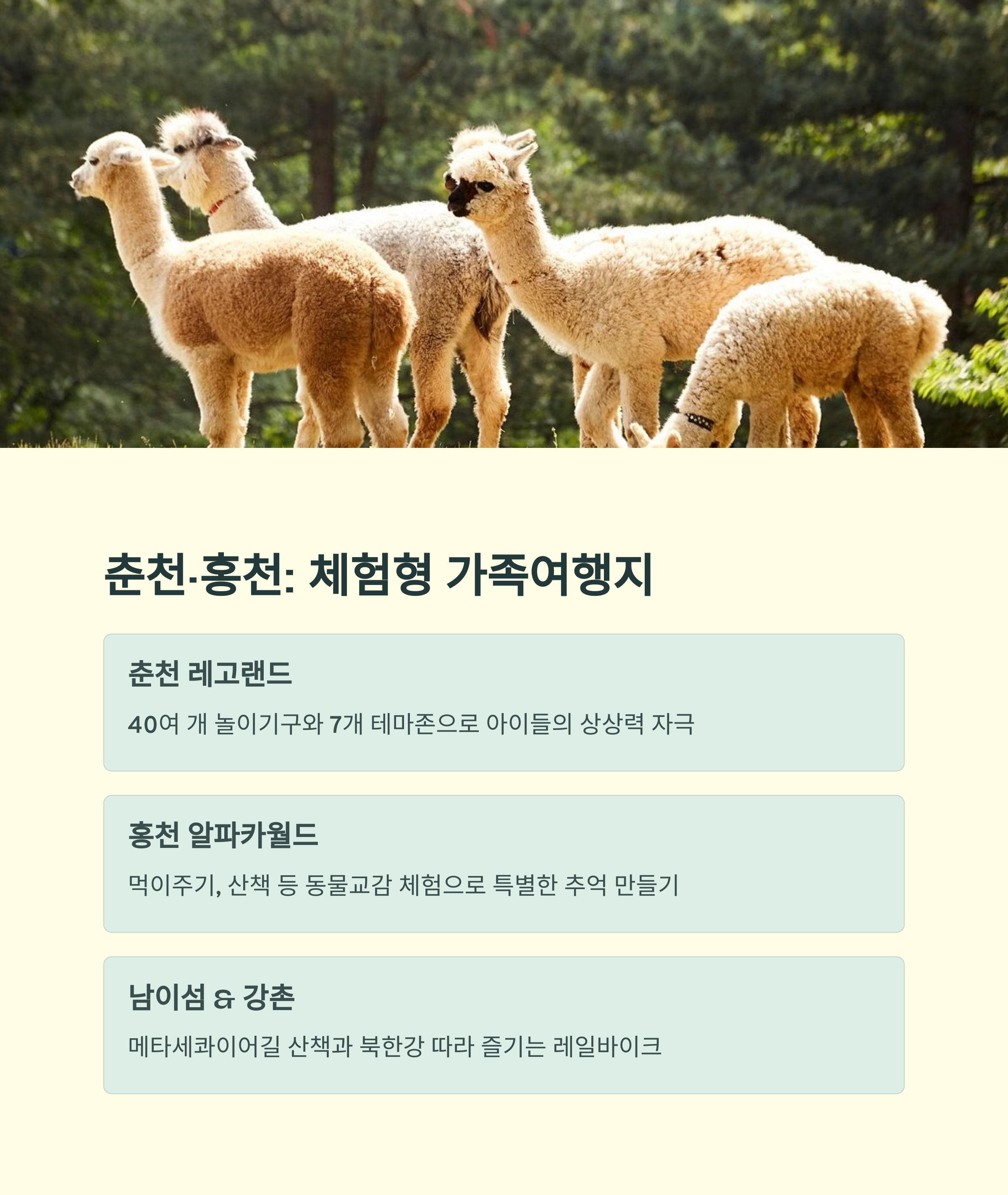 홍천 알파카월드, 평택 농업생태원, 담양 죽녹원 등은 동물과 교감하고 식물과 숲 체험도 가능한 복합형 공간이라 아이들과 함께 하루 종일 보내기 좋아요.