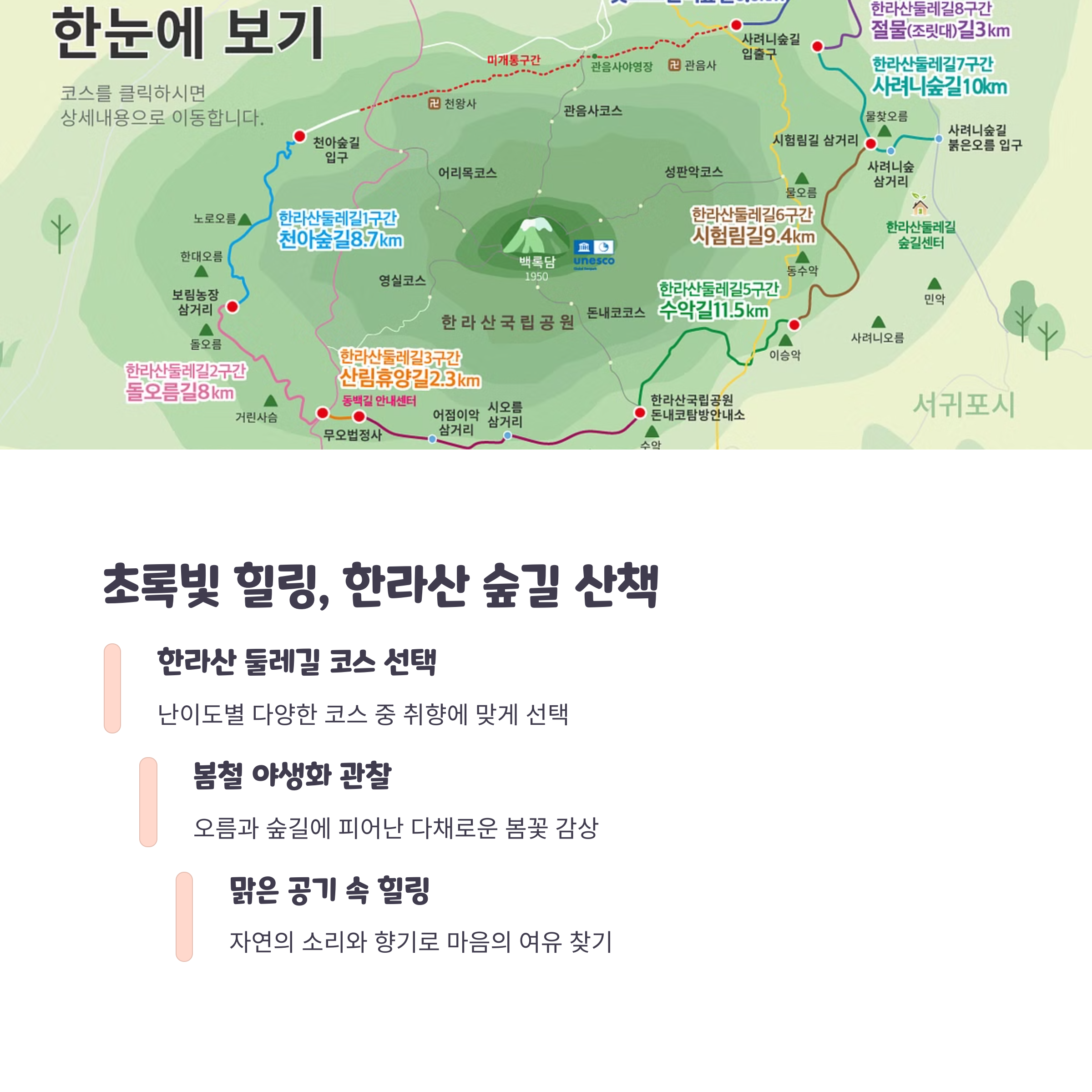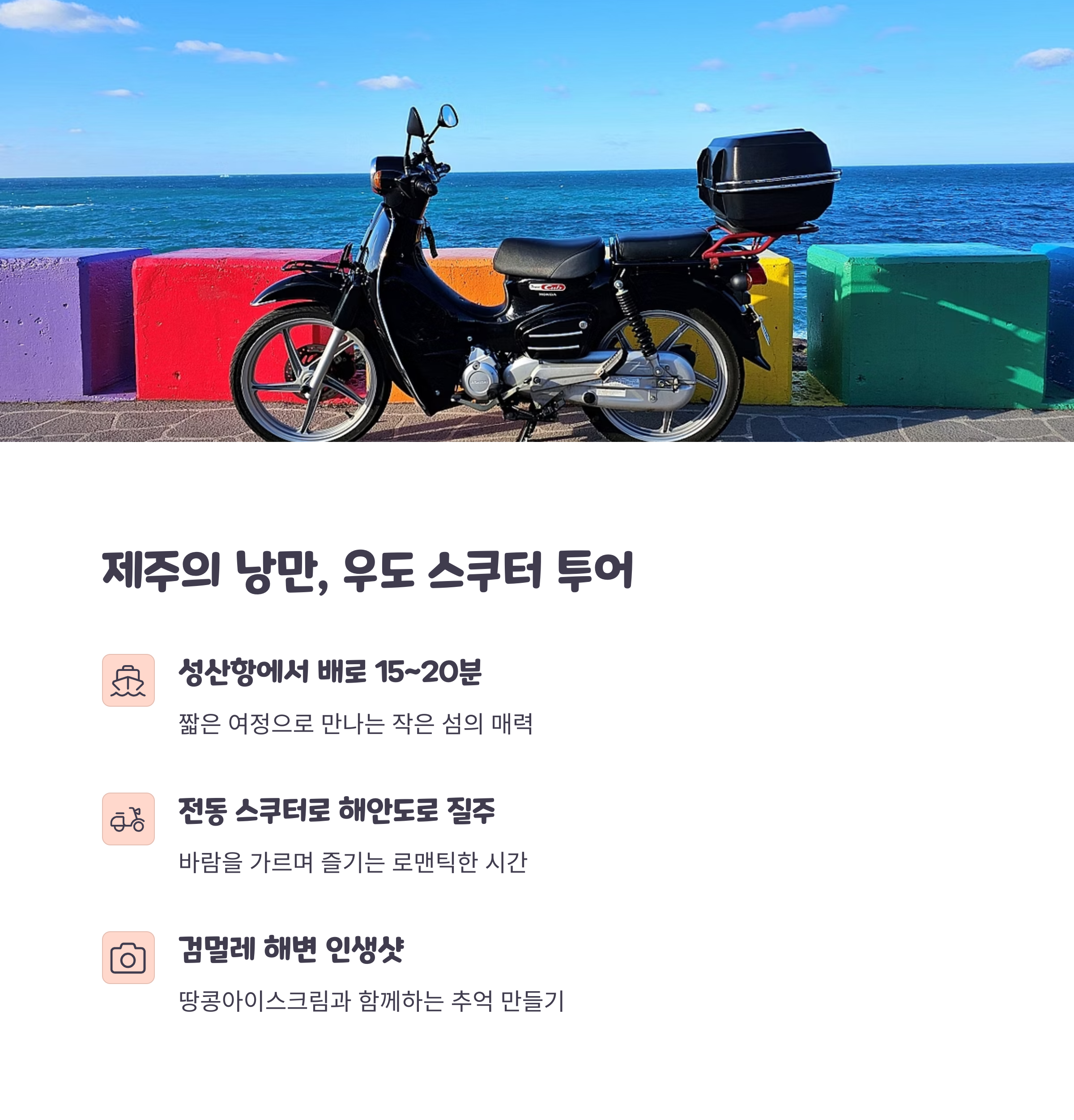 | 제주 감성 코스 | 우도 스쿠터·한라산 숲길·카페 힐링 |