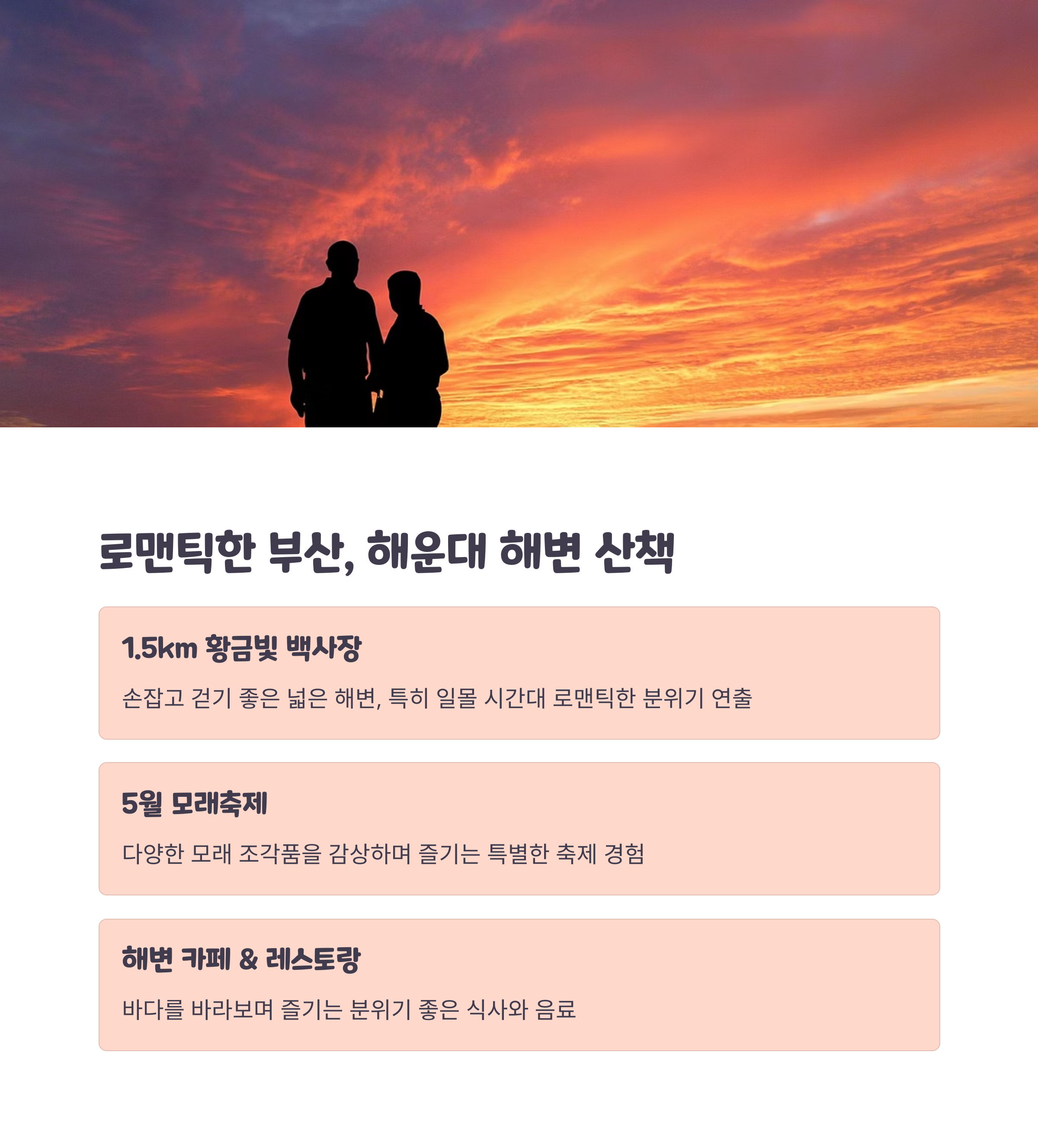부산은 바다와 도시 감성이 잘 어우러진 데이트 장소가 많습니다. 해운대 해변을 따라 산책</strong하고, 저녁 무렵에는 감천문화마을에서 알록달록한 예술 거리를 걸으며 감성 사진을 남겨보세요. 태종대 전망대</strong는 드넓은 바다를 한눈에 담을 수 있어 데이트 마무리 장소로도 제격입니다. 해질녘의 태종대는 분위기마저 로맨틱하죠. 맛집 탐방과 함께 코스를 구성하면 완벽한 하루가 될 수 있습니다.