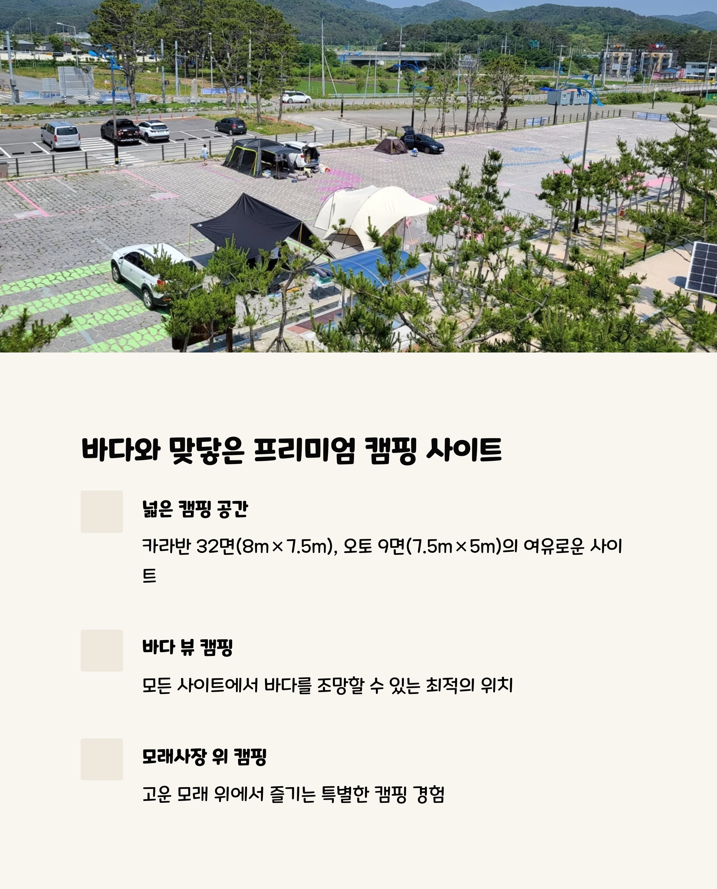 추천 포인트 바다 일출 감상, 모래사장 캠핑, 소형견 동반 가능