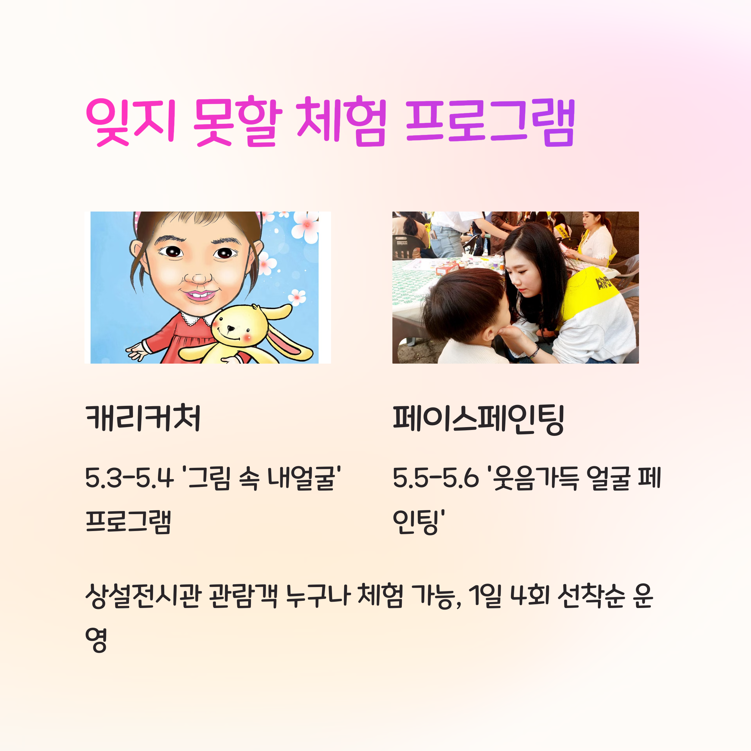 | 5월 3~6일 행사, 관람객 집중 시기 | 페이스페인팅, 캐리커처 체험 인기 | 가족 단위 포토존 및 즉석 사진 촬영 |