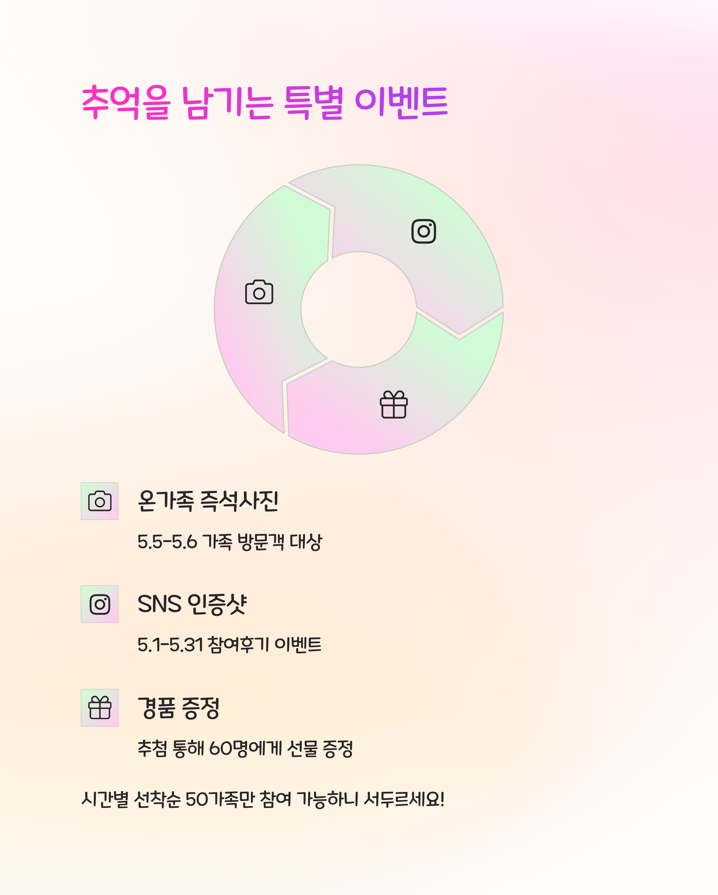 특별 행사 기간 동안에는 하루 두 번 캐릭터 인형극과 마술쇼가 열리고, 야외광장에서는 페이스페인팅, 캐리커처 등 체험 부스가 운영돼 아이들이 직접 참여하며 즐길 수 있어요. 생태연못 공간에서는 물고기 방사와 생태해설이 진행되어 환경교육도 함께 할 수 있고, 곳곳에 포토존과 가족사진 즉석 촬영 부스도 마련돼 추억 만들기 장소로도 최고입니다.
