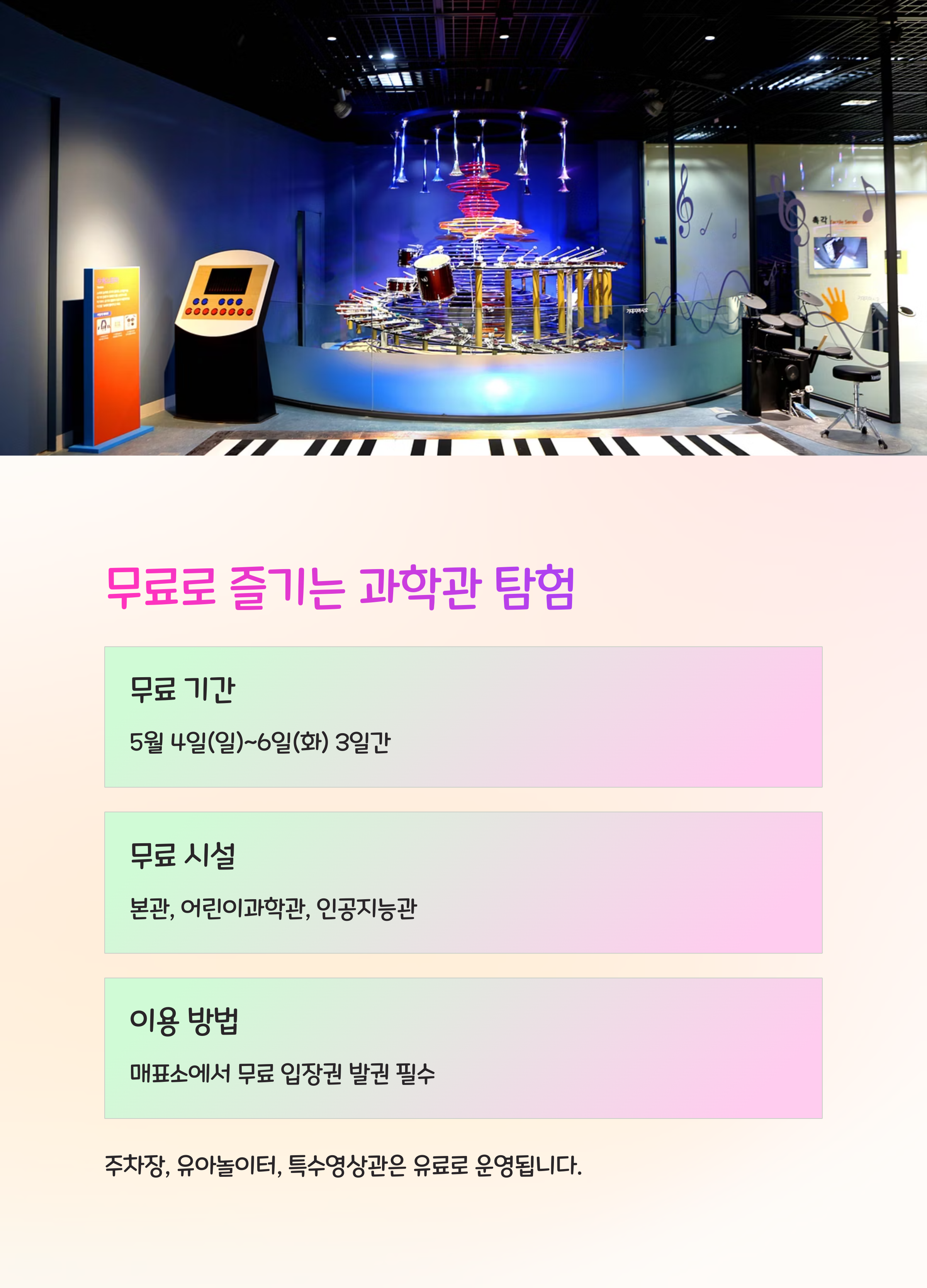5월 4일~6일에는 본관, 어린이과학관, AI전시관 모두 무료 개방되며, 별도의 사전 예약 없이 현장 접수로 입장 가능합니다.