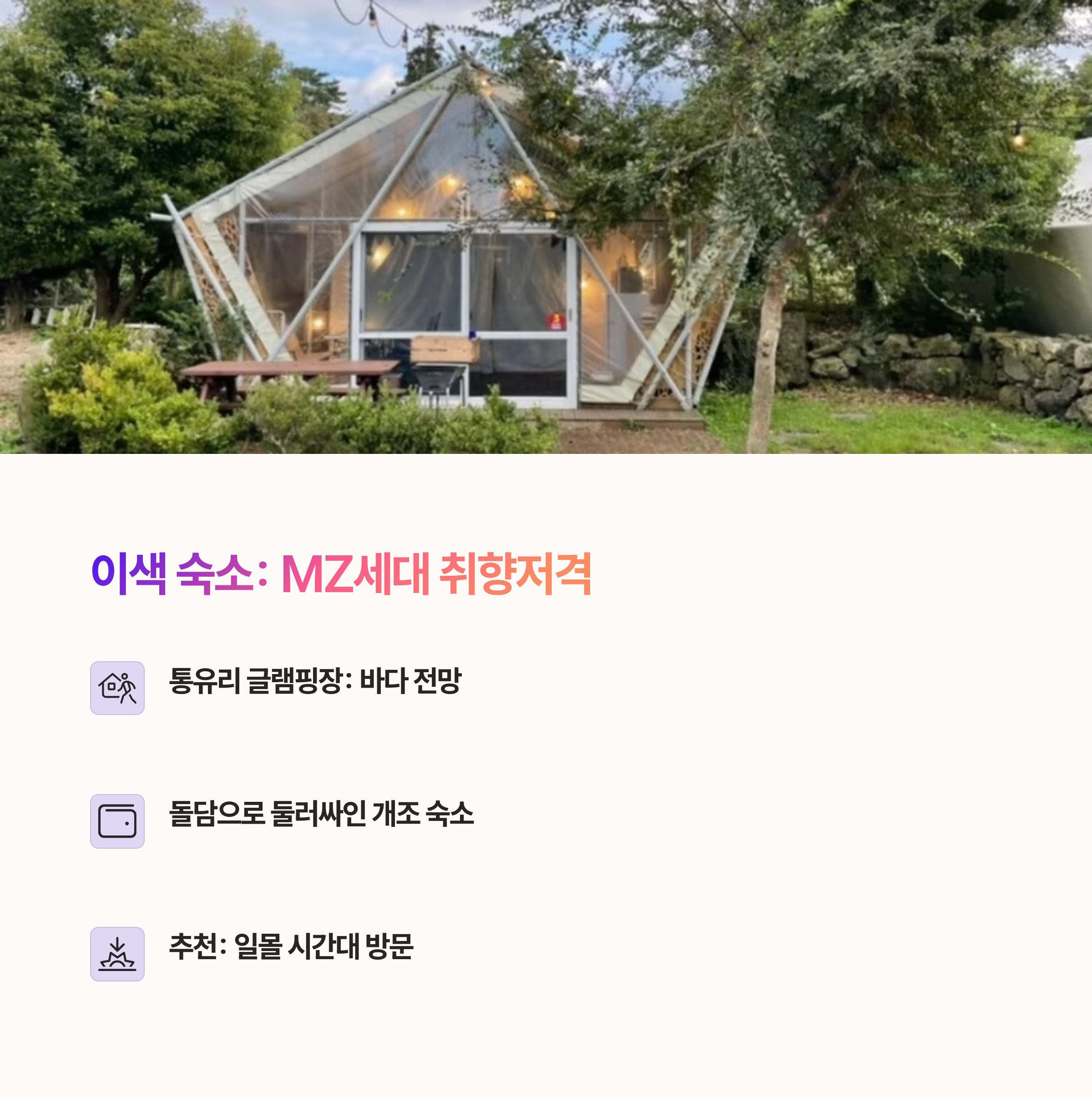 제주 신상 여행지에서 빠질 수 없는 트렌드가 바로 이색 숙소</strong입니다. 유리돔 글램핑장, 돌담 리모델링 숙소, 자연 친화적인 감성 숙소 등은 단순한 잠자리를 넘어서 여행의 목적지가 되곤 하죠. MZ세대 사이에선 ‘숙소가 곧 콘텐츠’라는 말이 나올 정도로 사진, 영상, 분위기를 모두 챙길 수 있는 공간이 필수로 여겨집니다. 특히 일몰 시간, 커튼을 걷고 바다를 바라보는 그 순간은 SNS 피드를 감성으로 채우기에 딱 좋은 순간이에요.